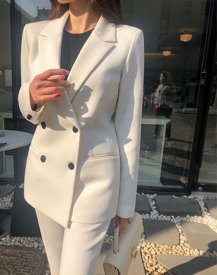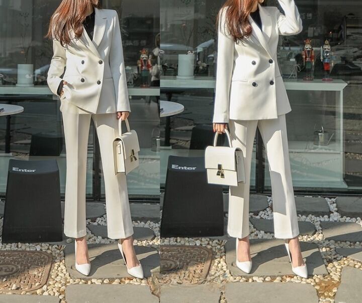 セットアップ スーツ パンツ ボトムス ジャケット ダブルブレスト 長袖 ロング アンクル丈 センタープレス ハイウエスト セミフレア ストレート 襟付き Vネック レトロ ビッグシルエット 韓国 スリム タイト きれいめ 高品質 大人 上品 ストレートパンツ フォーマル 秋 オータム 冬 ウィンター レディース 女性用 20代 30代 S M L XL 黒 ブラック 緑 グリーン ベージュ オフホワイト 大人カラー 秋カラー フェミニン オフィス プロフェッショナル エレガント OL