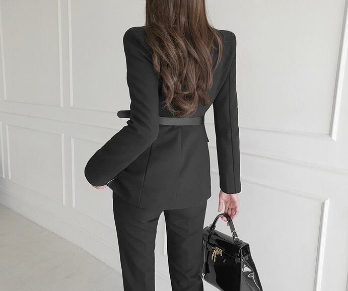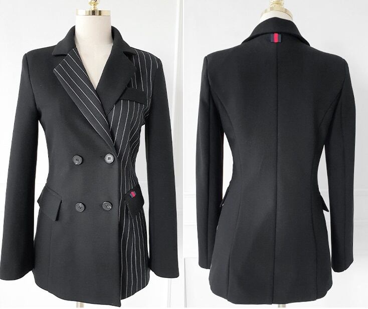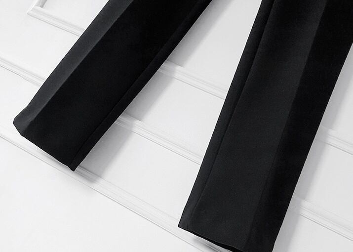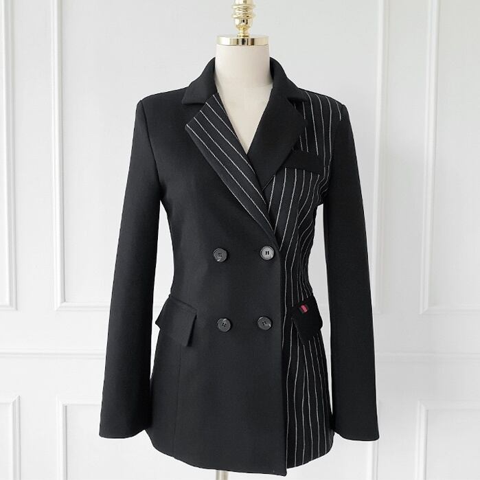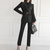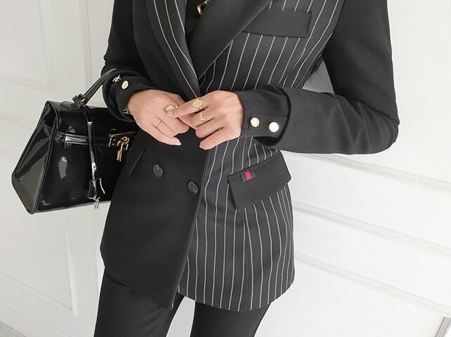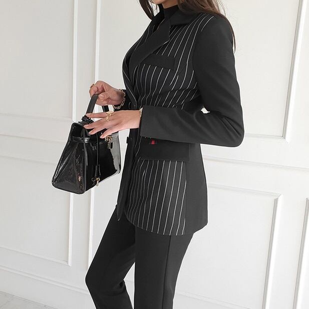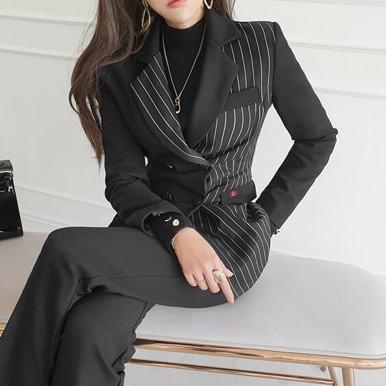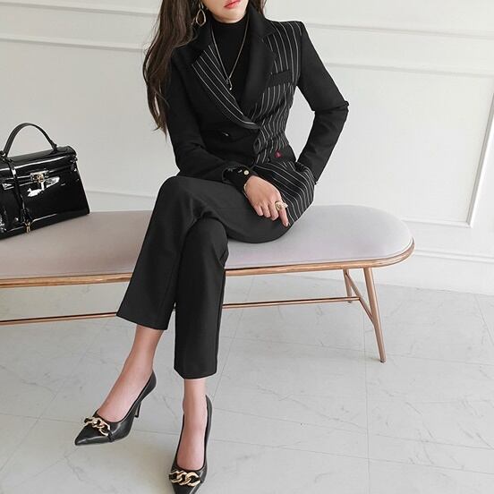 セットアップ スーツ パンツ ボトムス ジャケット ダブルブレスト ストライプ アシンメトリー 長袖 ロング アンクル丈 センタープレス ハイウエスト スキニー 襟付き Vネック レトロ ビッグシルエット 韓国 スリム タイト きれいめ 高品質 大人 上品 ストレートパンツ フォーマル 秋 オータム 冬 ウィンター レディース 女性用 20代 30代 S M L XL 黒 ブラック 大人カラー 秋カラー フェミニン オフィス プロフェッショナル エレガント OL