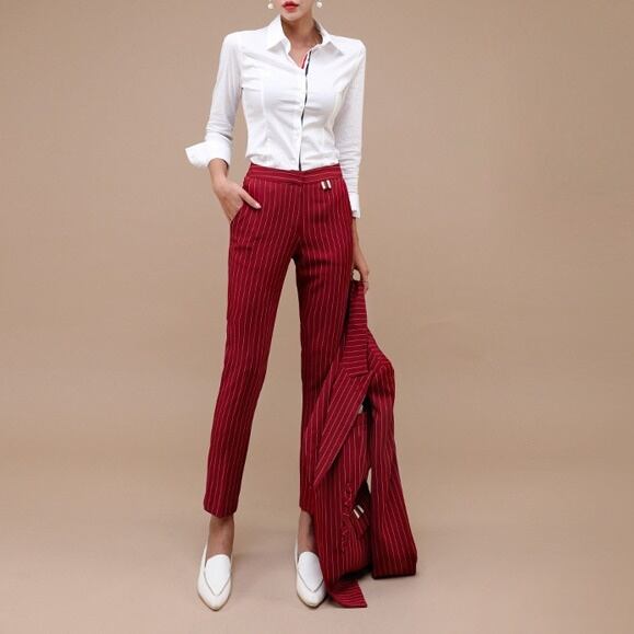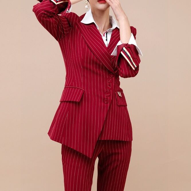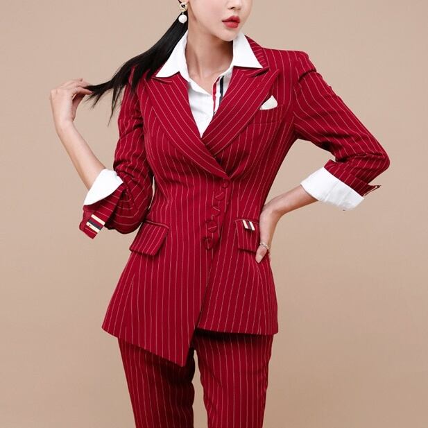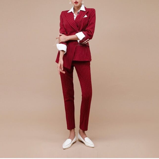 セットアップ スーツ パンツ ボトムス ジャケット ダブルブレスト 長袖 ロング アンクル丈 ストライプ アシンメトリー ハイウエスト セミフレア ストレート 襟付き Vネック レトロ ビッグシルエット 韓国 スリム タイト きれいめ 高品質 大人 上品 ストレートパンツ フォーマル 秋 オータム 冬 ウィンター レディース 女性用 20代 30代 S M L XL 黒 ブラック 緑 大人カラー 秋カラー フェミニン オフィス プロフェッショナル エレガント OL レッド