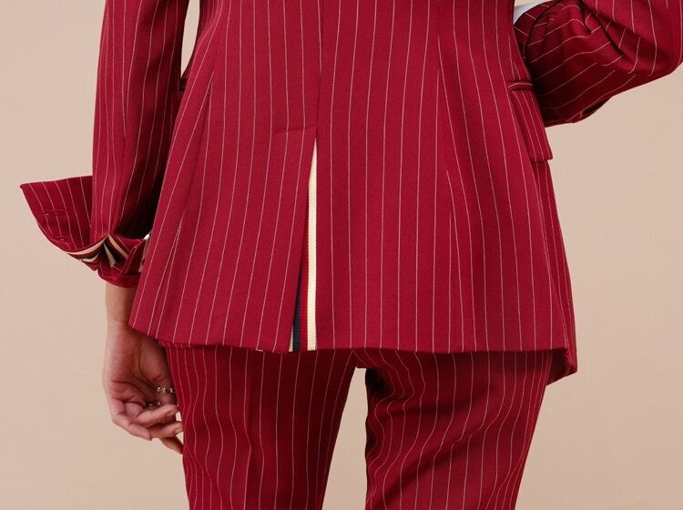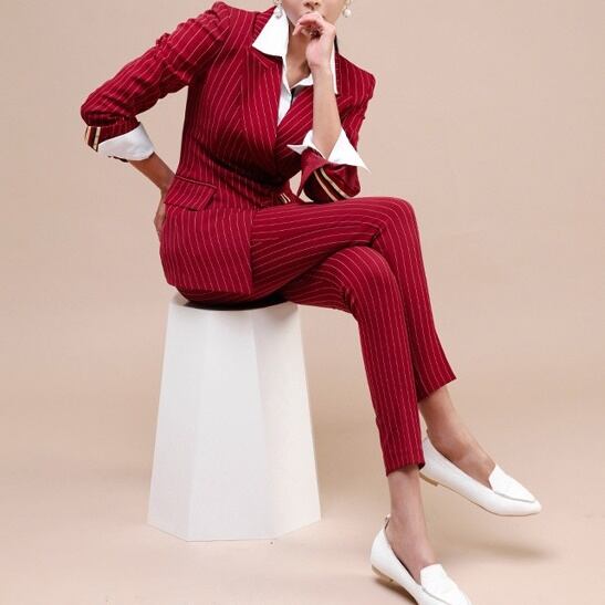 メリハリのあるスリムな仕立てが綺麗なストライプパンツスーツセットです。