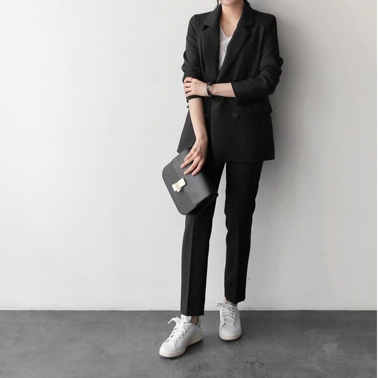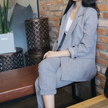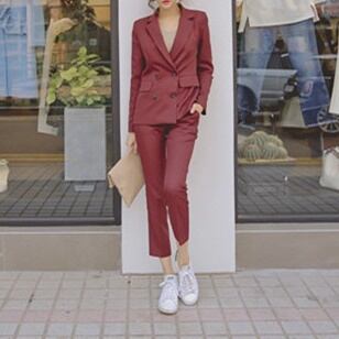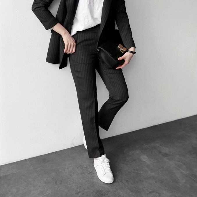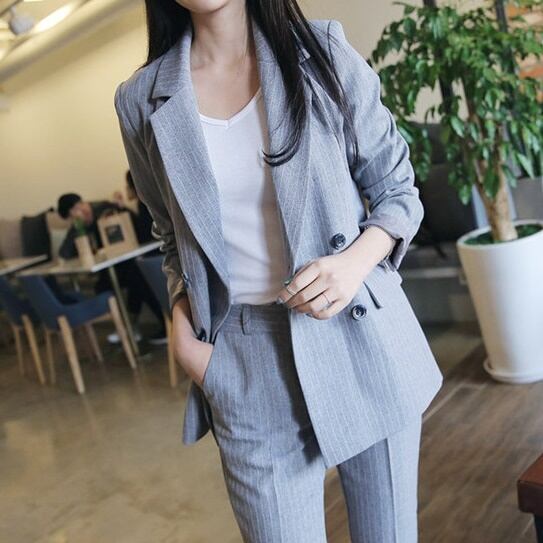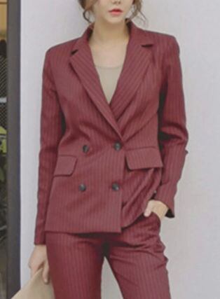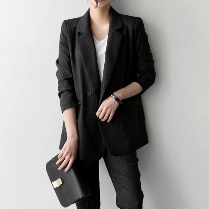 セットアップ スーツ パンツ ボトムス ジャケット ダブルブレスト 長袖 ロング ストライプ アンクル丈 センタープレス スリム ハイウエスト セミフレア ストレート 襟付き Vネック レトロ ビッグシルエット 韓国 スリム タイト きれいめ 高品質 大人 上品 ストレートパンツ フォーマル 秋 オータム 冬 ウィンター レディース 女性用 20代 30代 S M L XL 黒 ブラック 緑 大人カラー 秋カラー フェミニン オフィス プロフェッショナル エレガント OL グリーン イエロー ピンク