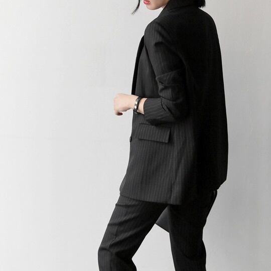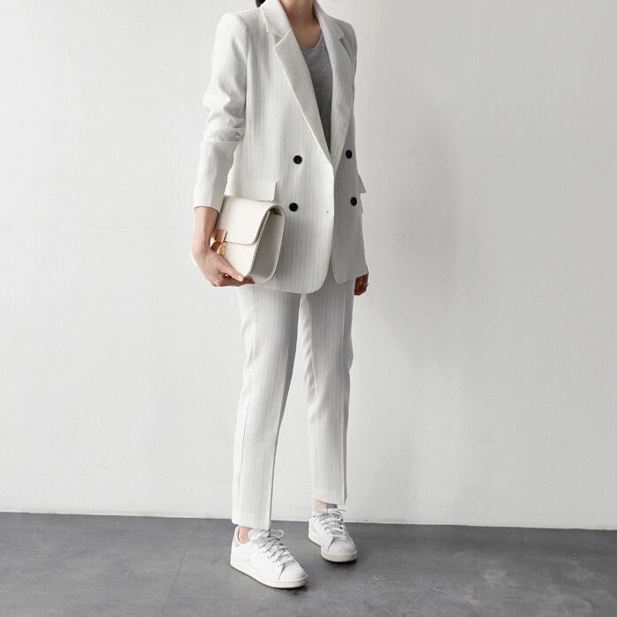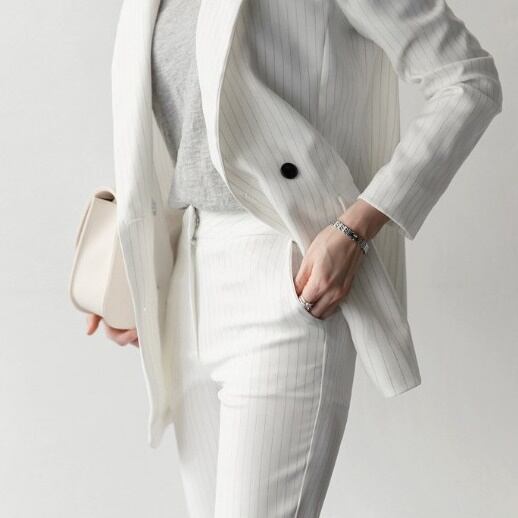 メリハリのあるスリムな仕立てが綺麗なストライプパンツスーツセットです。