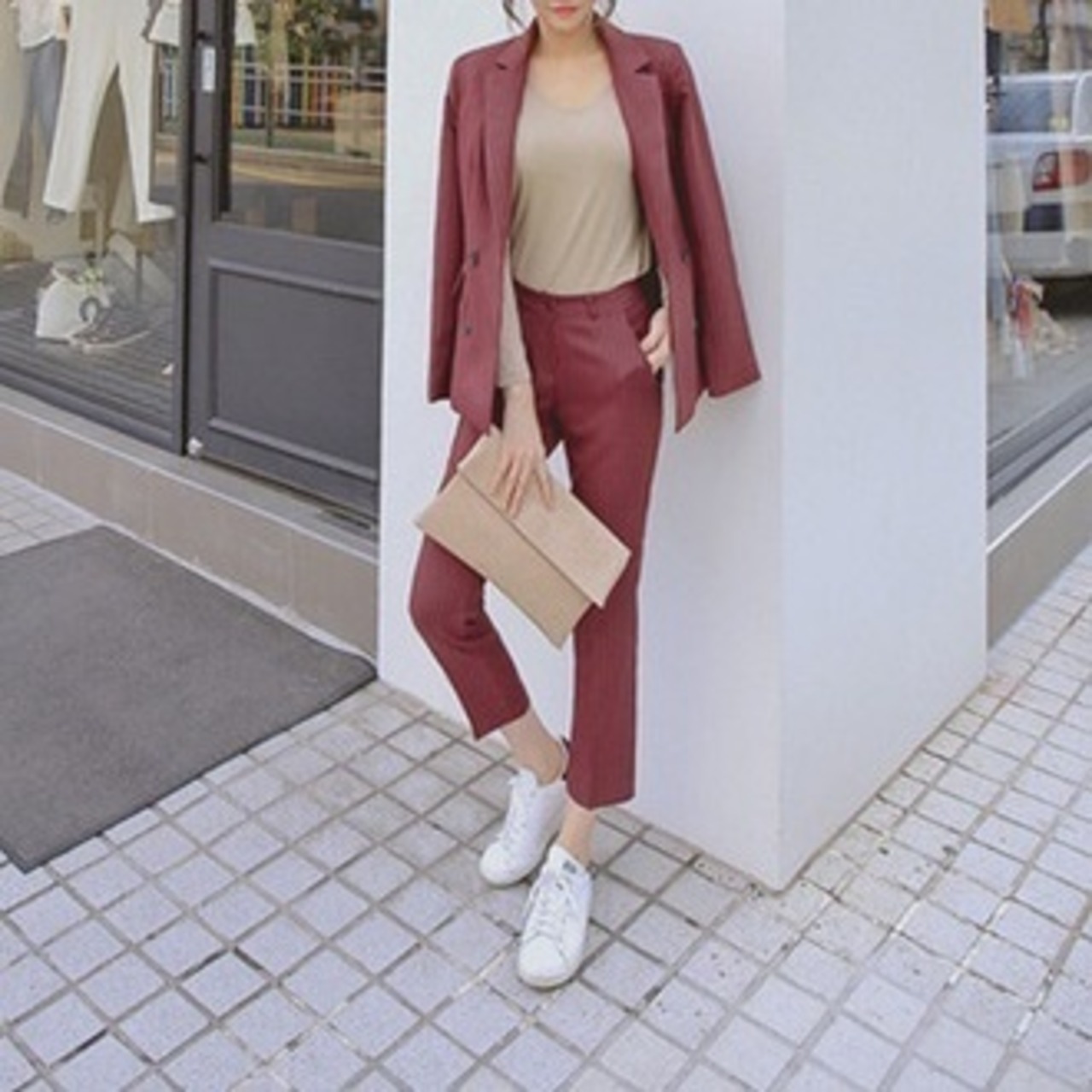 センタープレス入りの美脚効果抜群の細身アンクルパンツの2点セットです。
