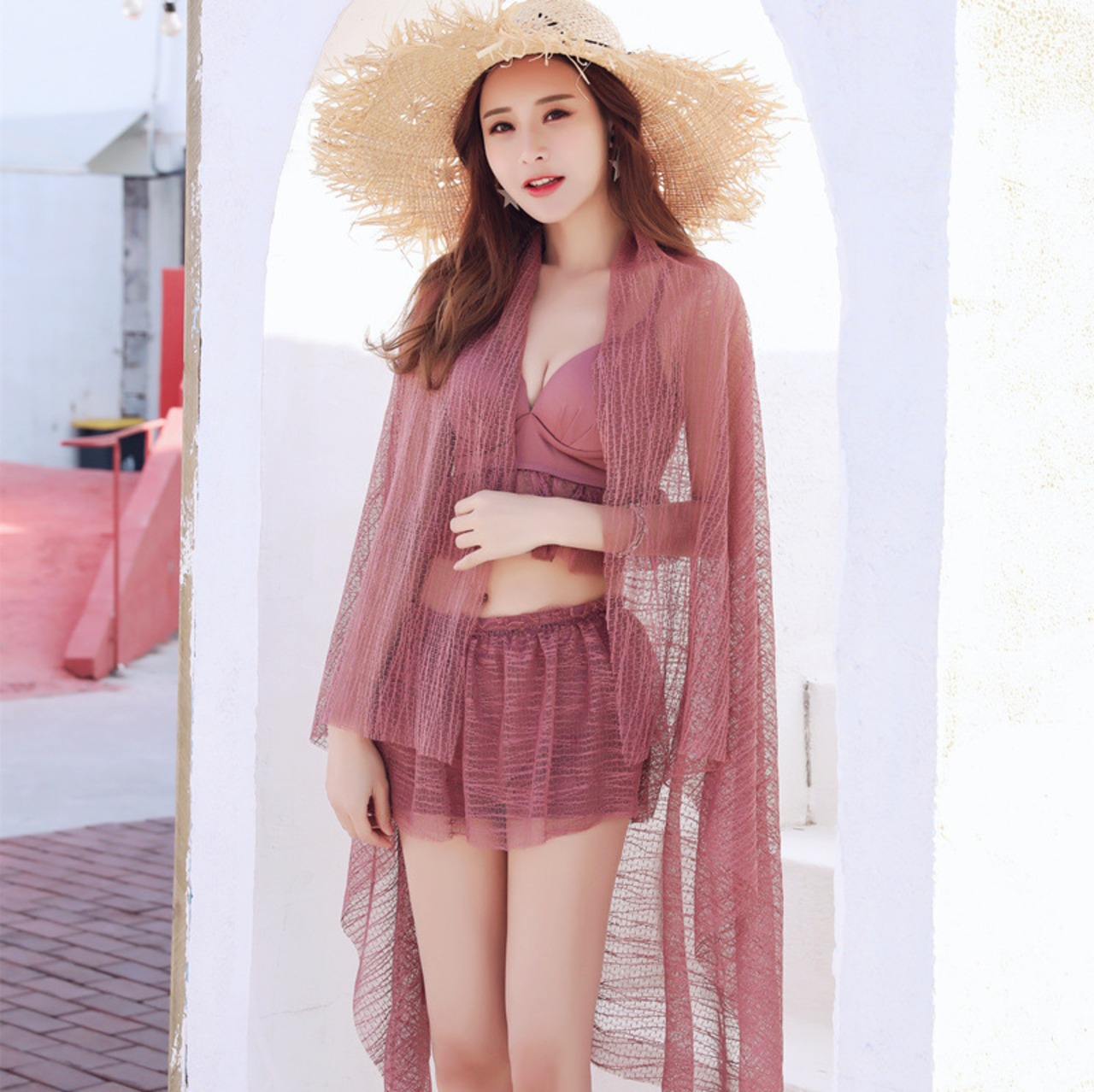 トップ、スカート付ショーツ、パレオの3点セット。