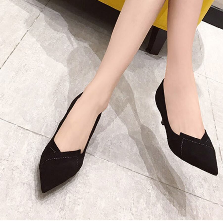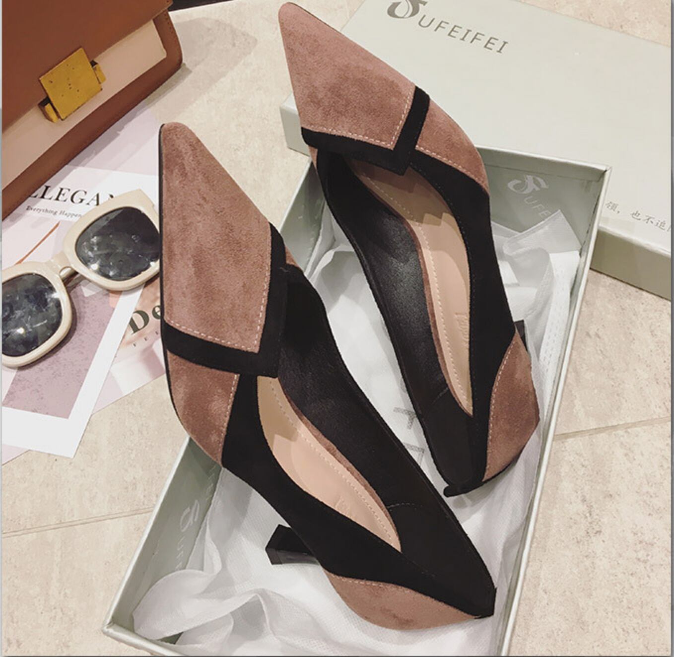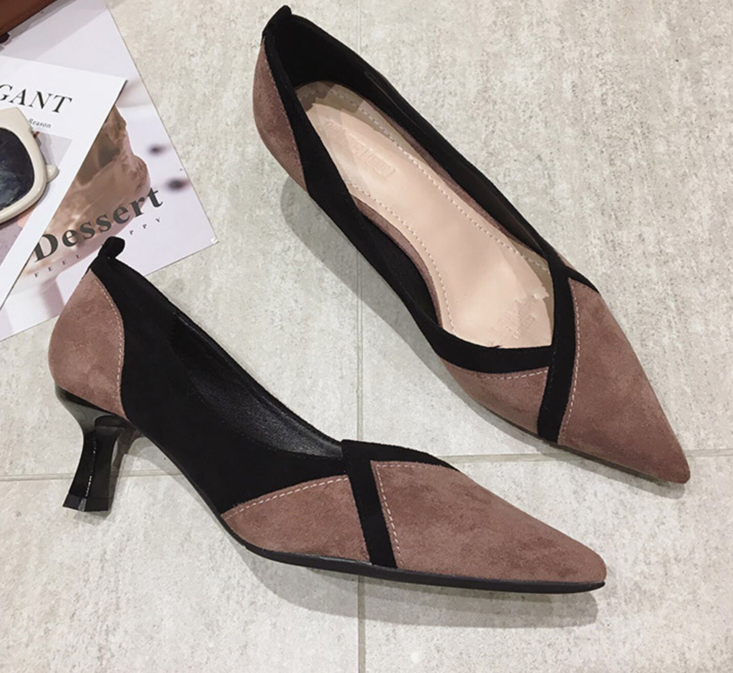 スエード生地のエレガントなあポインテッドトゥハイヒールパンプス。