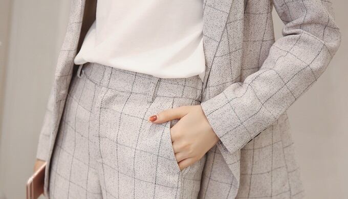 メリハリのあるスリムな仕立てが綺麗なチェックパンツスーツセットです。