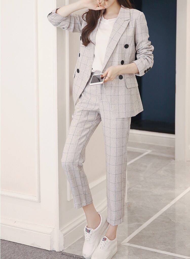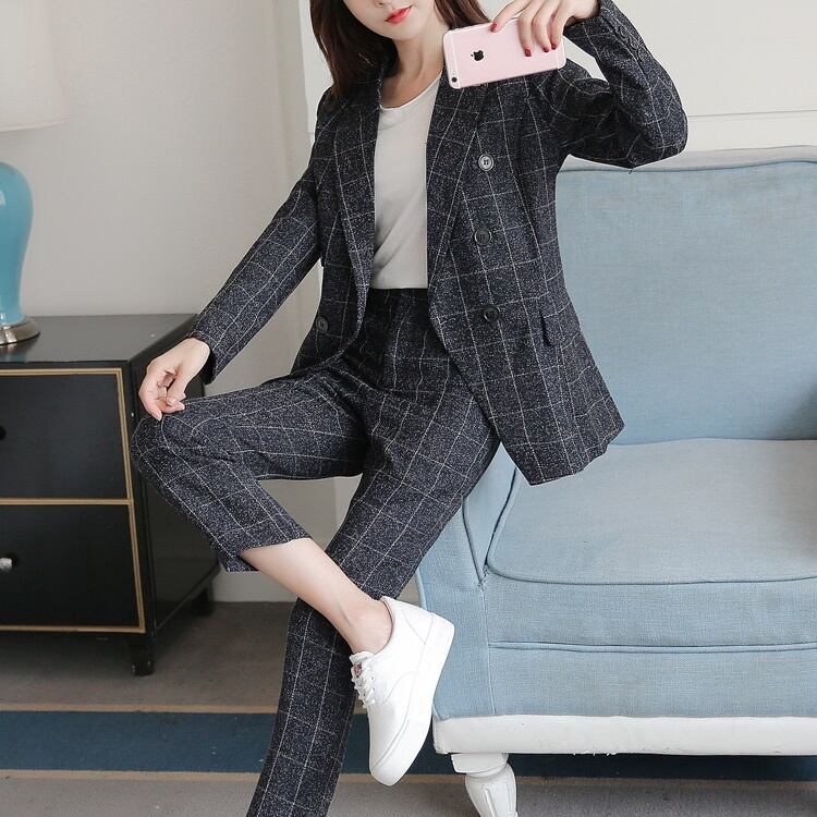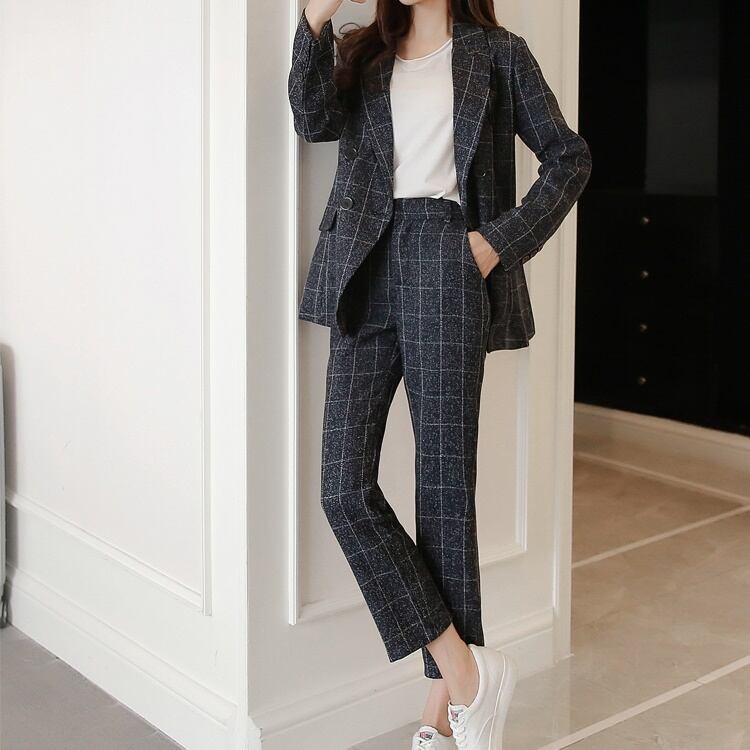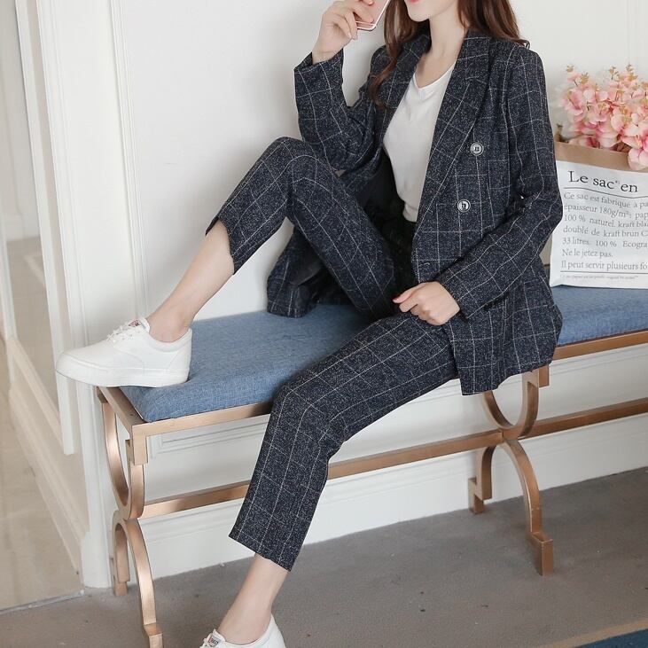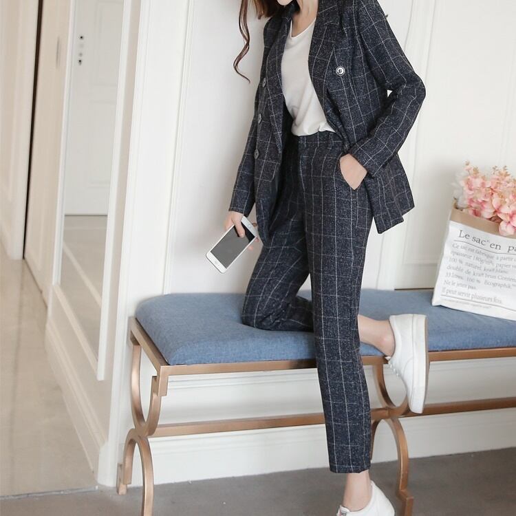 セットアップ スーツ パンツ ボトムス ジャケット ダブルブレスト 長袖 ロング チェック 格子柄 アンクル丈 スリム ハイウエスト セミフレア ストレート 襟付き Vネック レトロ ビッグシルエット 韓国 スリム タイト きれいめ 高品質 大人 上品 ストレートパンツ フォーマル 秋 オータム 冬 ウィンター レディース 女性用 20代 30代 S M L XL 黒 ブラック 緑 大人カラー 秋カラー フェミニン オフィス プロフェッショナル エレガント OL ホワイト ネイビー
