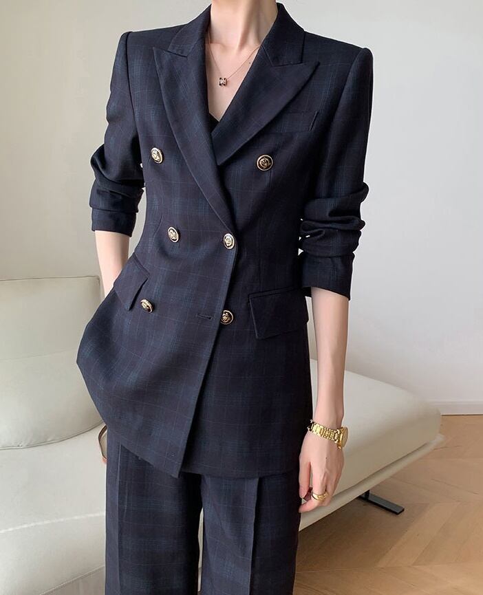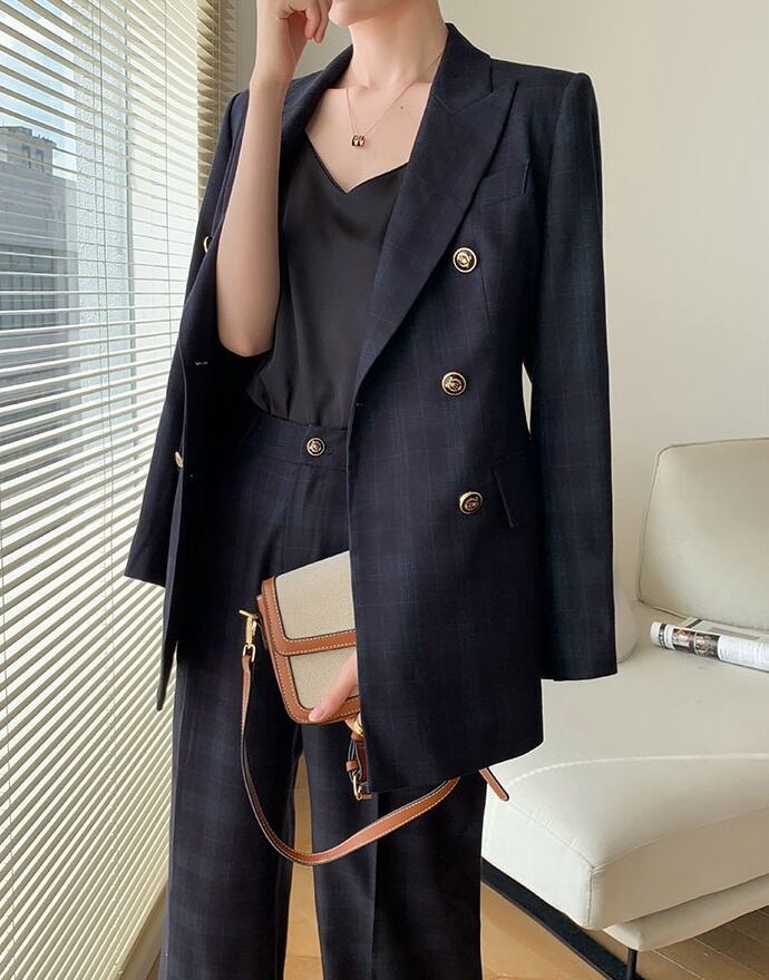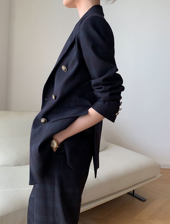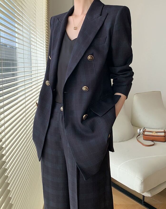 セットアップ スーツ パンツ ボトムス ジャケット ダブルブレスト 長袖 ロング チェック 格子柄 ワイドパンツ ハイウエスト セミフレア ストレート 襟付き Vネック レトロ ビッグシルエット 韓国 スリム タイト きれいめ 高品質 大人 上品 ストレートパンツ フォーマル 秋 オータム 冬 ウィンター レディース 女性用 20代 30代 S M L XL 黒 ブラック 緑 大人カラー 秋カラー フェミニン オフィス プロフェッショナル エレガント OL ホワイト ネイビー