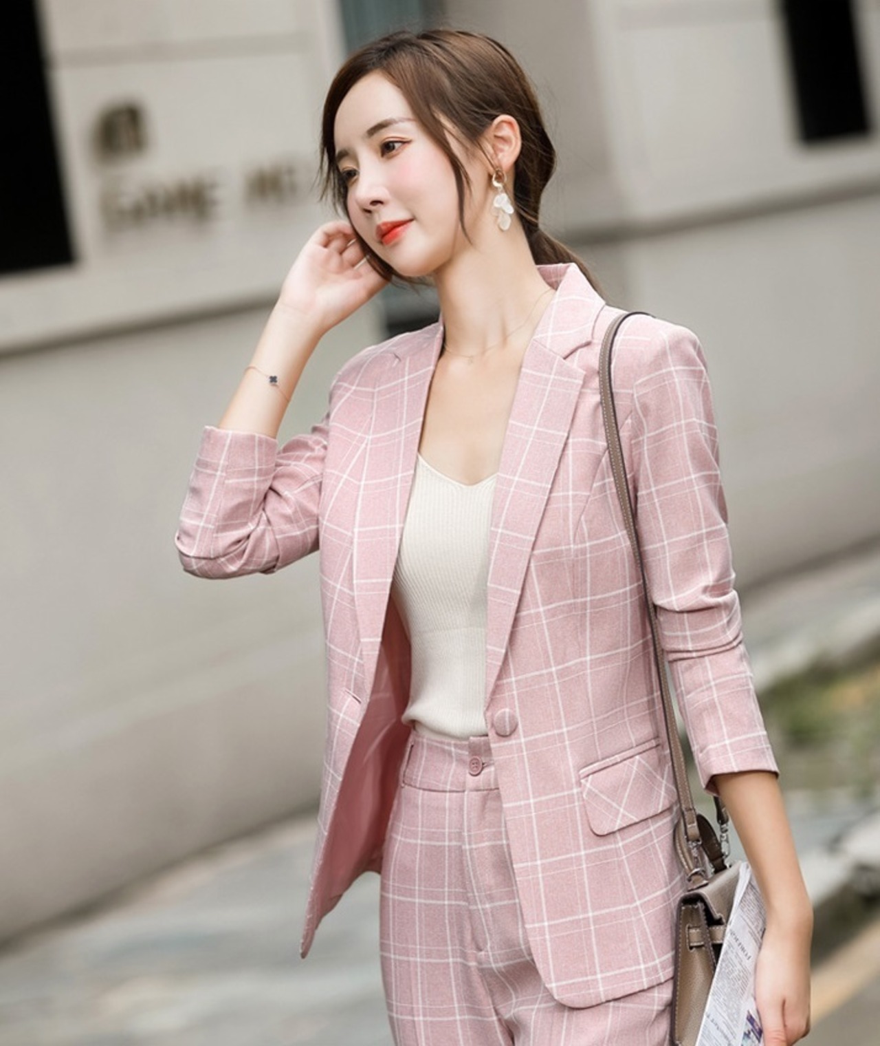大人上品なウィンドウペンチェック柄のジャケットとパンツのセットアップです。