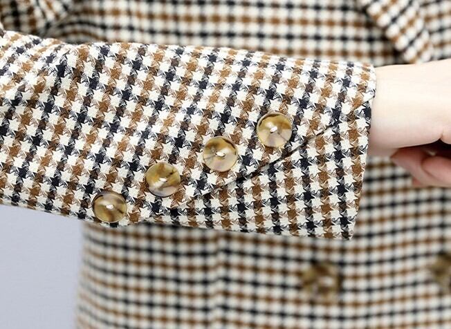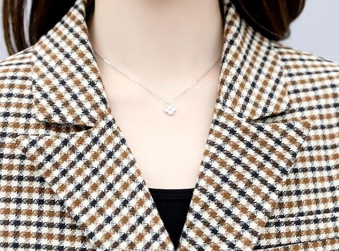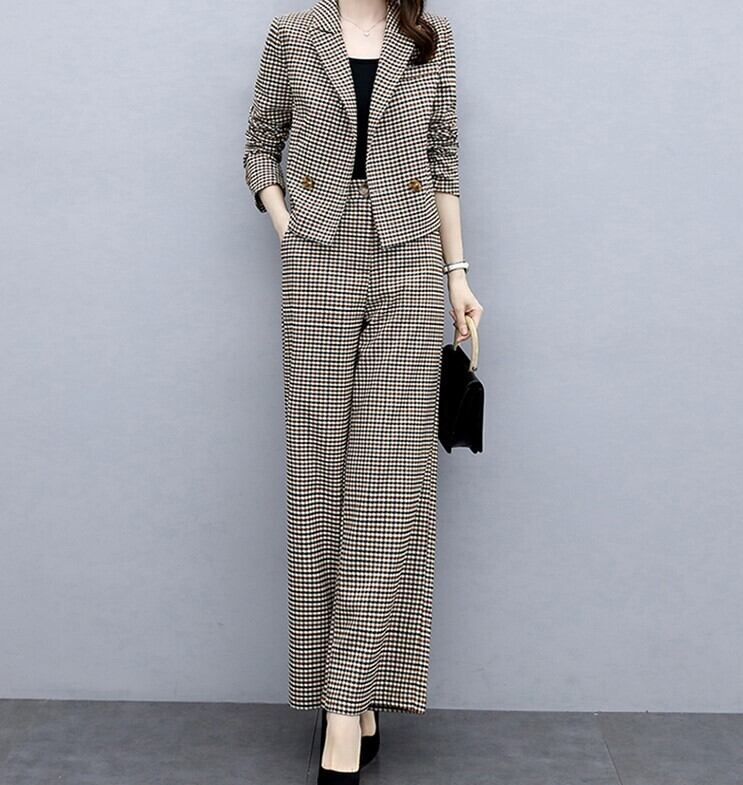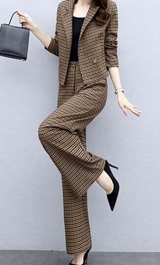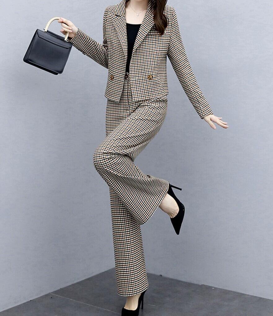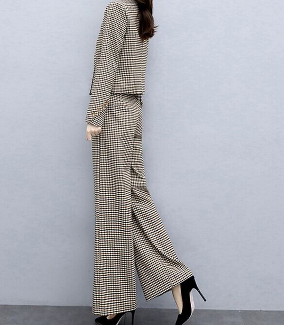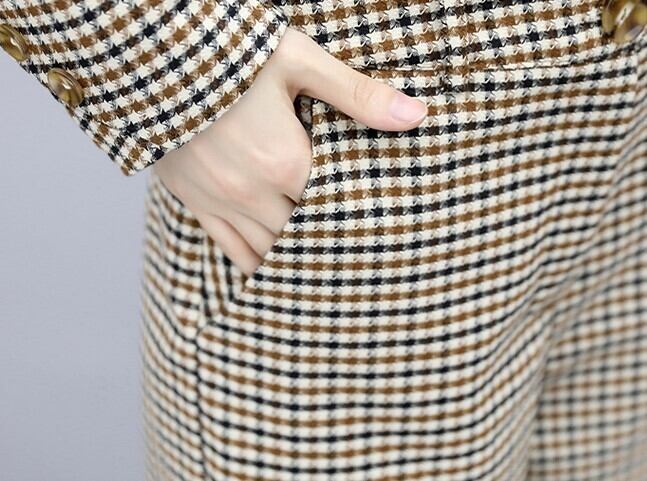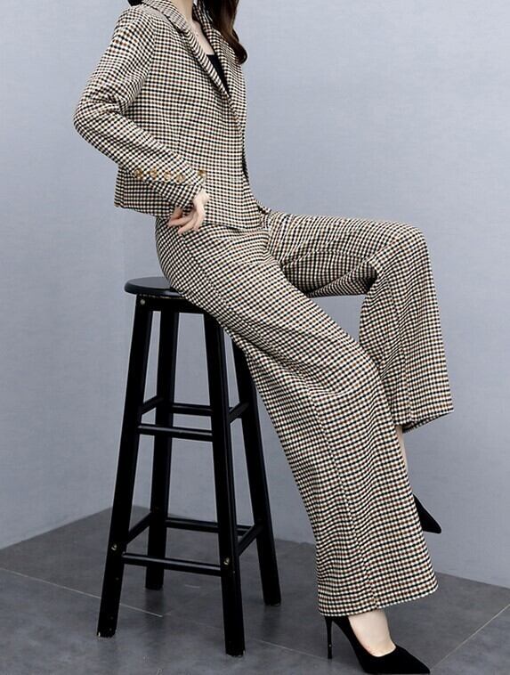 クロップ丈が旬顔のジャケットとパンツのチェック柄セットアップです。