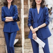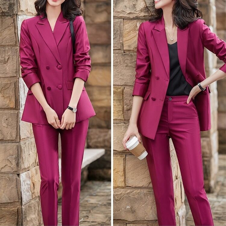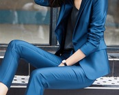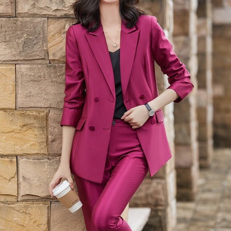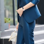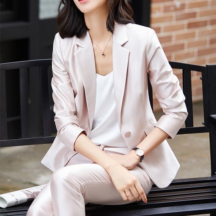サテン調の控えめなツヤ感のジャケットとパンツのセットアップです。
