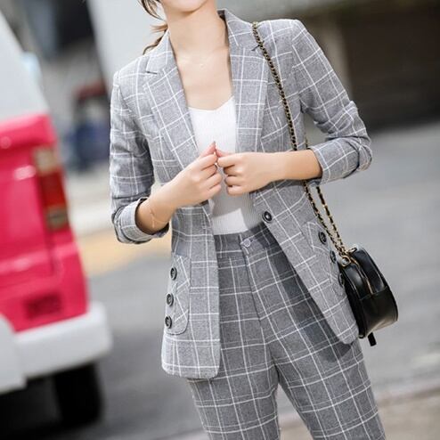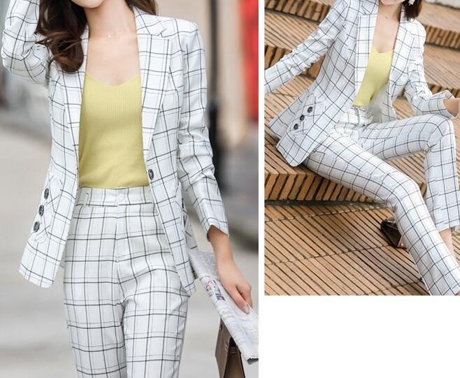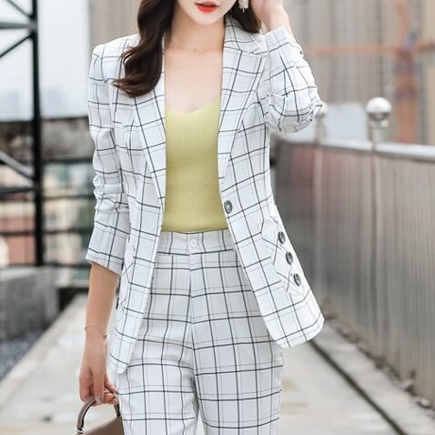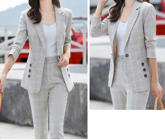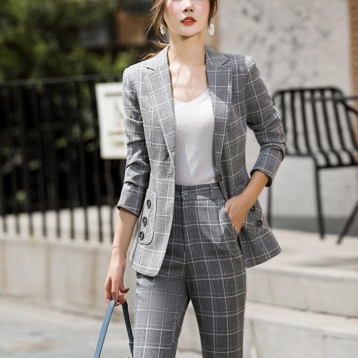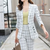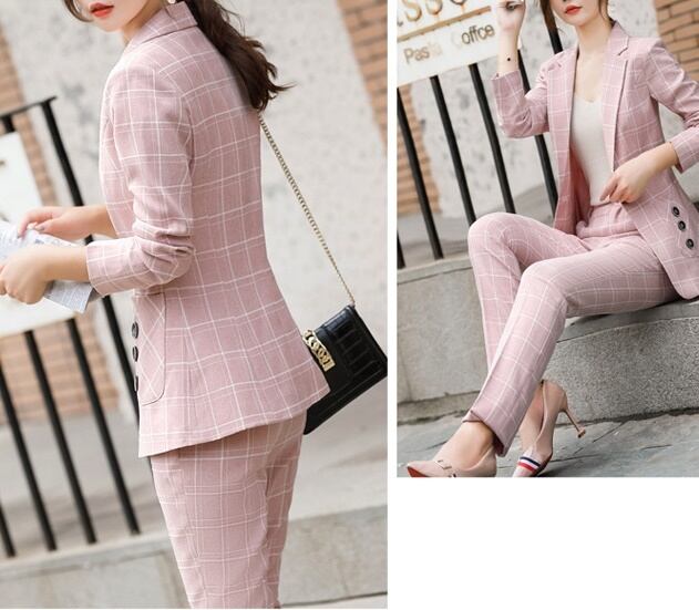 メリハリのあるスリムな仕立てが綺麗なチェックパンツスーツセットです。