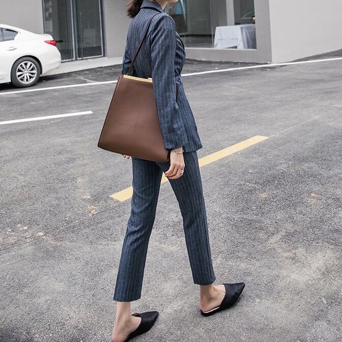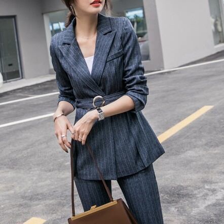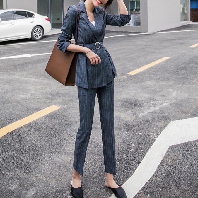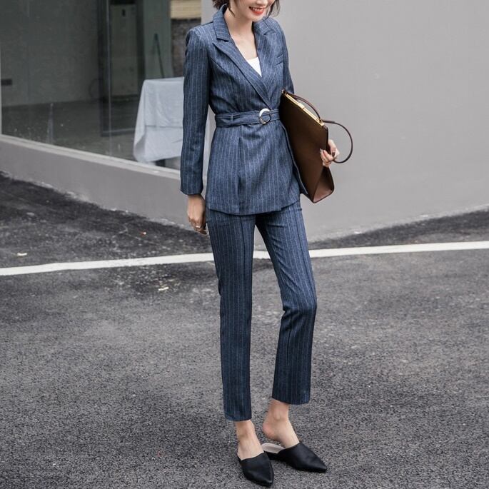 セットアップ スーツ パンツ ボトムス ジャケットベルト ハイウエスト バックル 長袖 ロング ストライプ アンクル丈 センタープレス セミフレア ストレート 襟付き Vネック レトロ ビッグシルエット 韓国 スリム タイト きれいめ 高品質 大人 上品 ストレートパンツ フォーマル 秋 オータム 冬 ウィンター レディース 女性用 20代 30代 S M L XL 黒 ブラック 緑 大人カラー 秋カラー フェミニン オフィス プロフェッショナル エレガント OL グリーン イエロー ピンク
