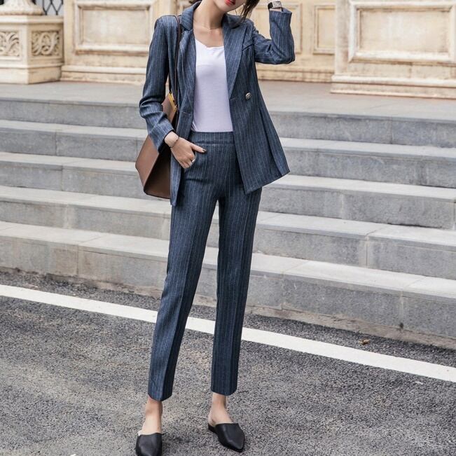 メリハリのあるスリムな仕立てが綺麗なストライプパンツスーツセットです。