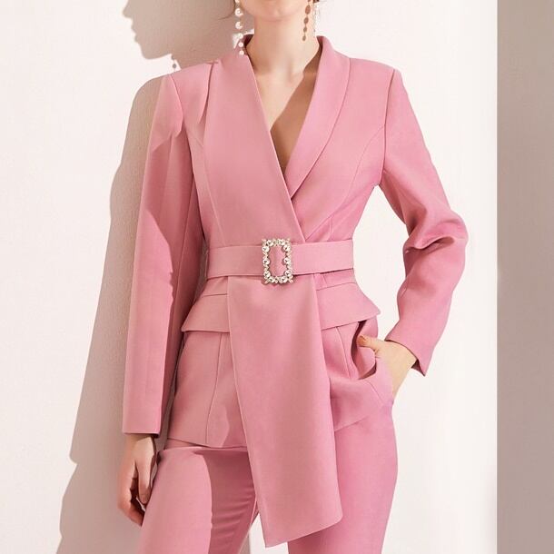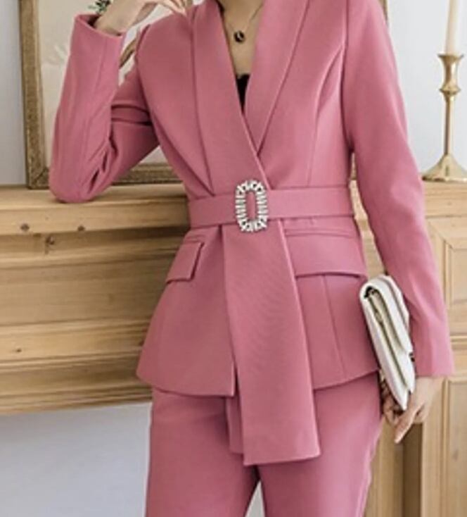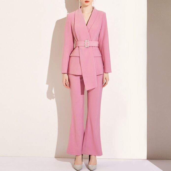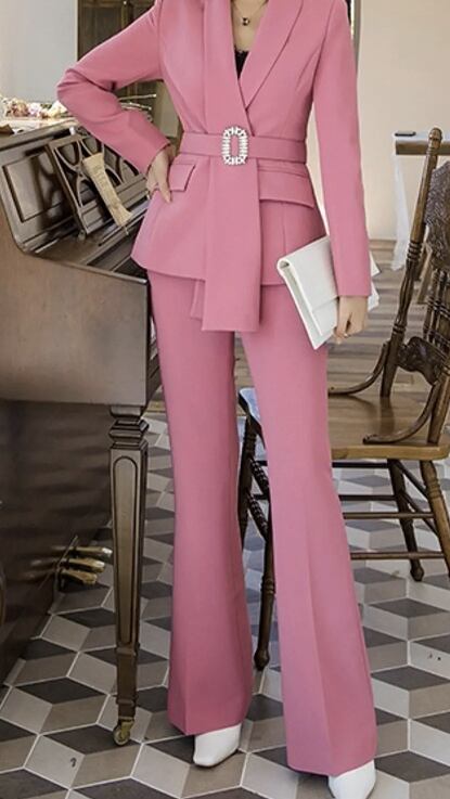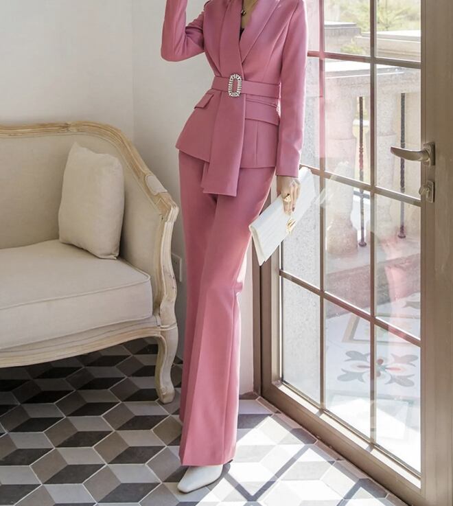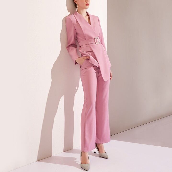 セットアップ スーツ パンツ ボトムス ジャケットベルト アシンメトリー ハイウエスト ビジュー スクエアバックル 長袖 ロング セミフレア ストレート 襟付き Vネック レトロ ビッグシルエット 韓国 スリム タイト きれいめ 高品質 大人 上品 ストレートパンツ フォーマル 秋 オータム 冬 ウィンター レディース 女性用 20代 30代 S M L XL 黒 ブラック 緑 大人カラー 秋カラー フェミニン オフィス プロフェッショナル エレガント OL グリーン イエロー ピンク