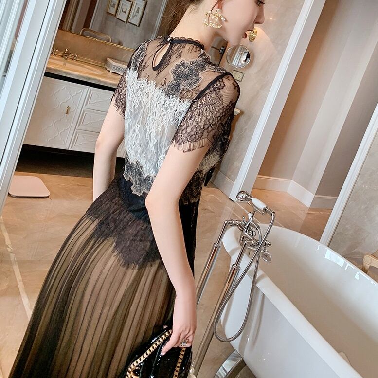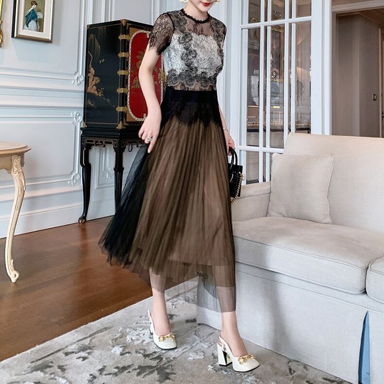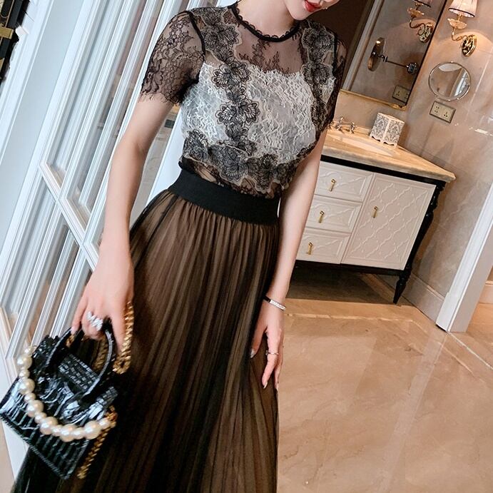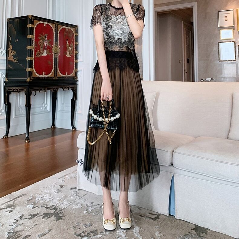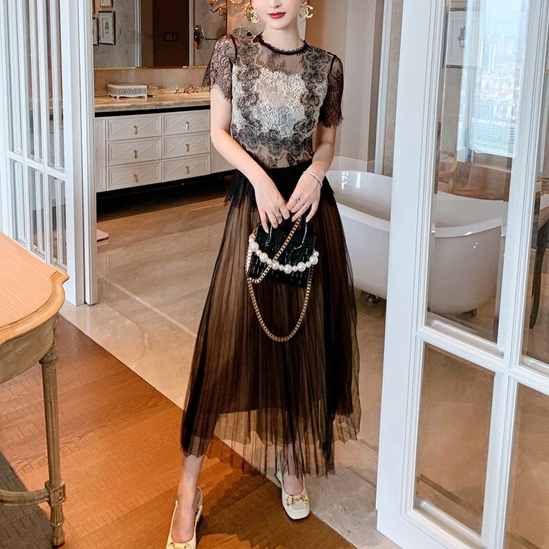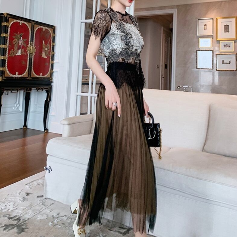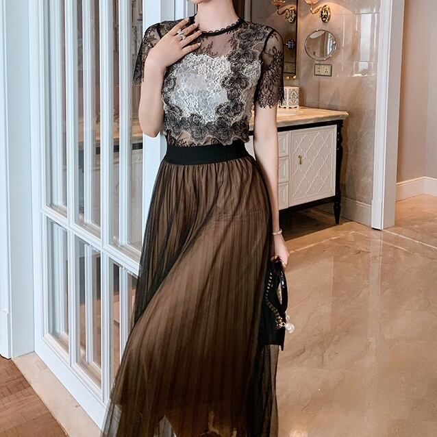 繊細なレース遣いと透け感が気品あふれるトップス&スカートのセットアップです。