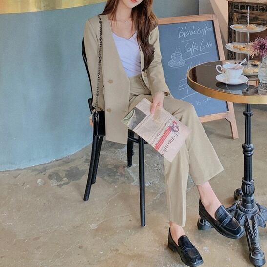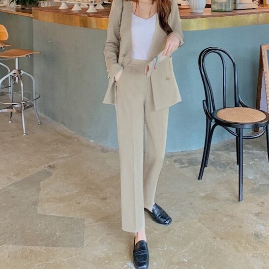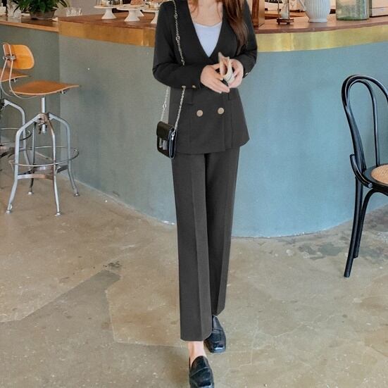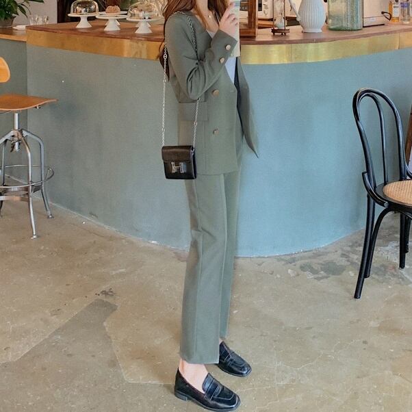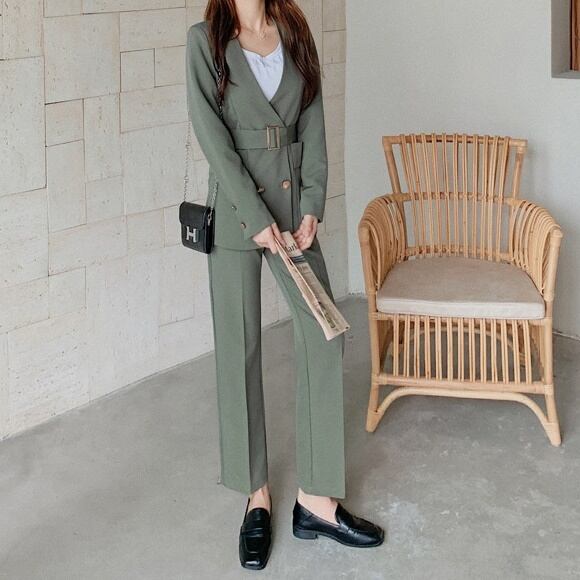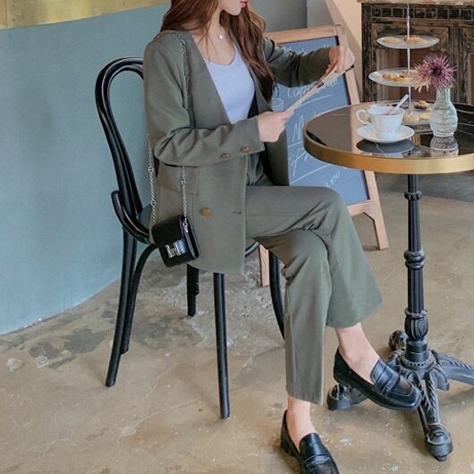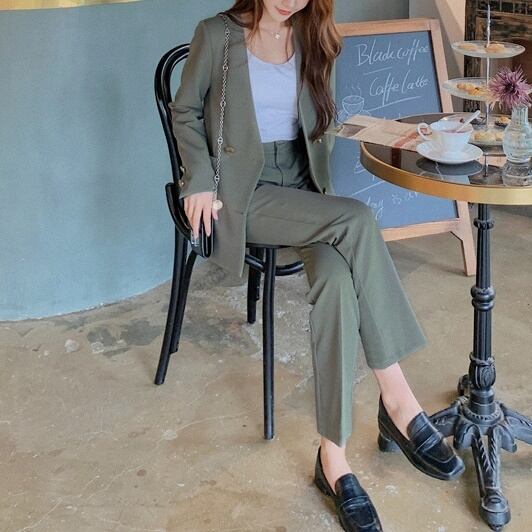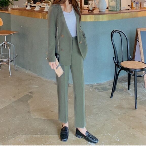 セットアップ スーツ パンツ ボトムス ジャケット メタルボタン ベルト付き ノーカラー 長袖 ロング アンクル丈 センタープレス スリム ハイウエストストレート 襟付き Vネック レトロ ビッグシルエット 韓国 スリム タイト きれいめ 高品質 大人 上品 ストレートパンツ フォーマル 秋 オータム 冬 ウィンター レディース 女性用 20代 30代 S M L XL 黒 ブラック 緑 大人カラー 秋カラー フェミニン オフィス プロフェッショナル エレガント OL ブラック カーキ