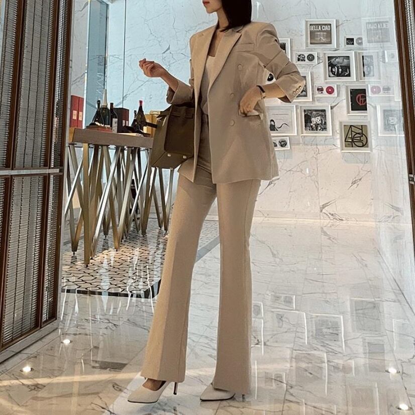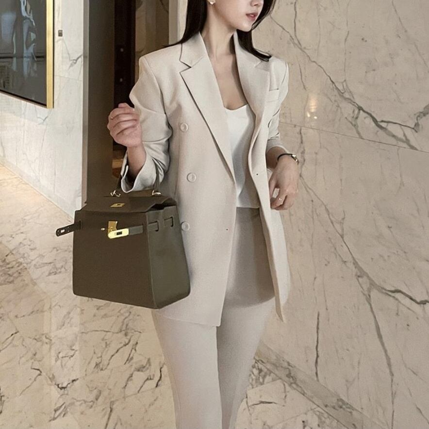 セットアップ スーツ パンツ ボトムス ジャケット ダブルブレスト くすみカラー 長袖 ロング アンクル丈 センタープレス ハイウエスト セミフレア ストレート 襟付き Vネック レトロ ビッグシルエット 韓国 スリム タイト きれいめ 高品質 大人 上品 ストレートパンツ フォーマル 秋 オータム 冬 ウィンター レディース 女性用 20代 30代 S M L XL 黒 ブラック 緑 大人カラー 秋カラー フェミニン オフィス プロフェッショナル エレガント OL グリーン イエロー ピンク