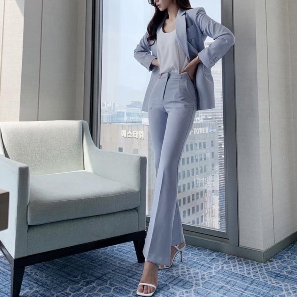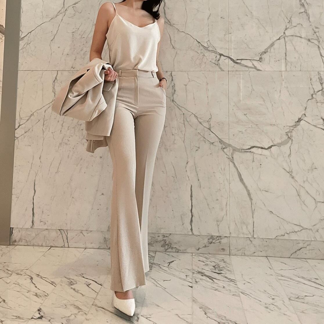 センタープレス入りの美脚効果抜群のフレアパンツの2点セットです。