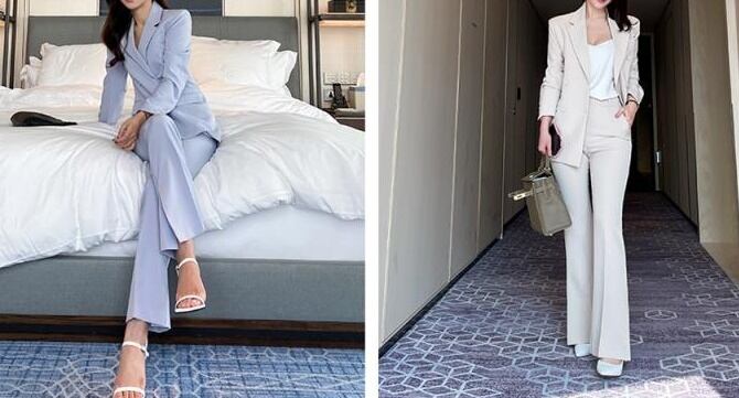 メリハリのあるスリムな仕立てが綺麗なパンツスーツセットです。