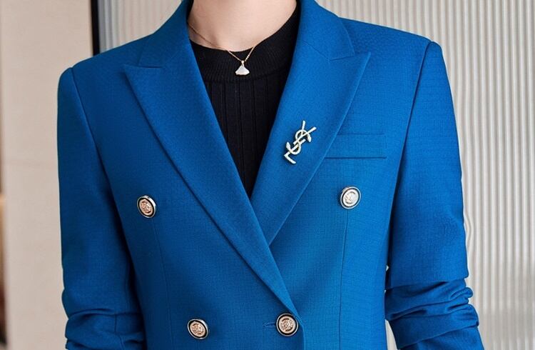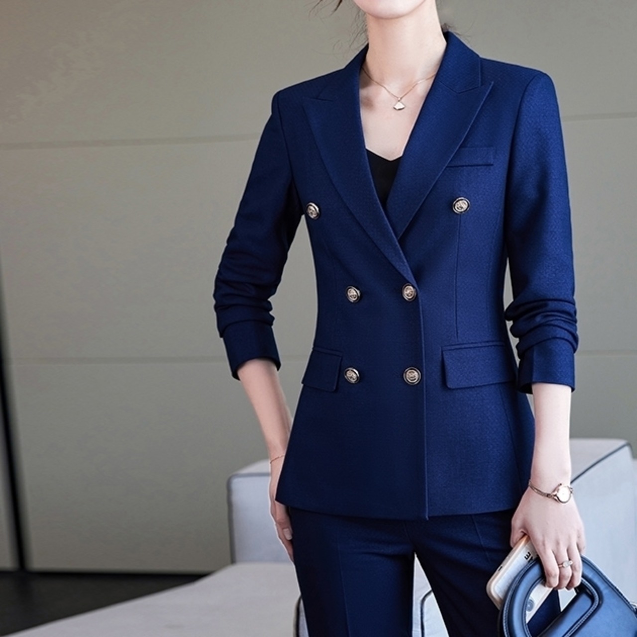 ハイウエストと上品なボタンのダブルブレスト仕立てがハンサムなジャケットと