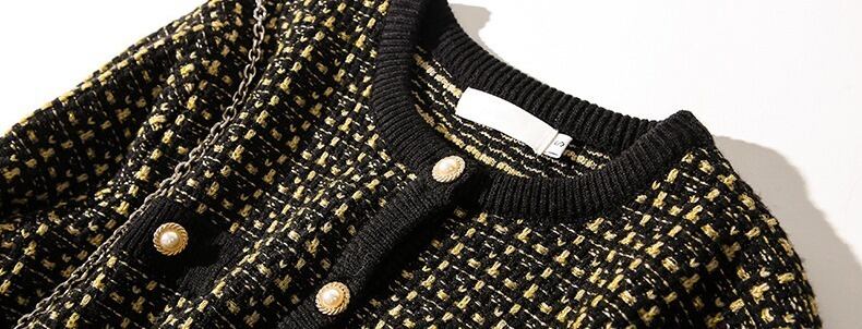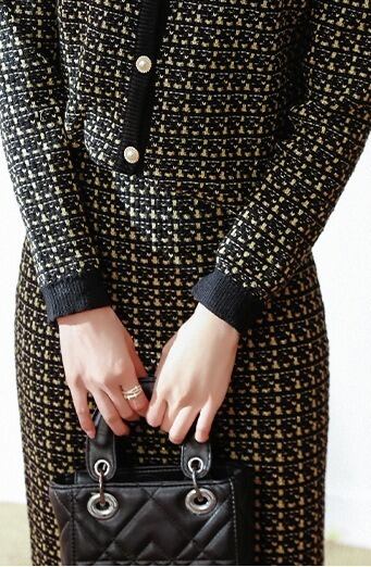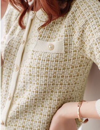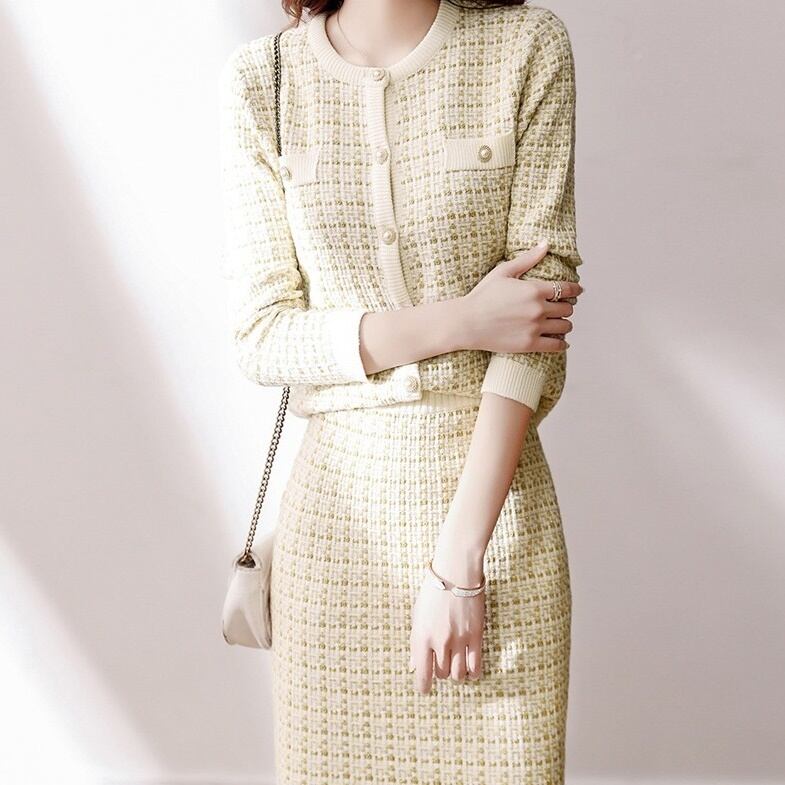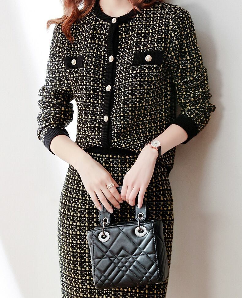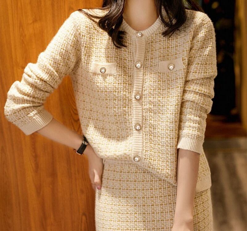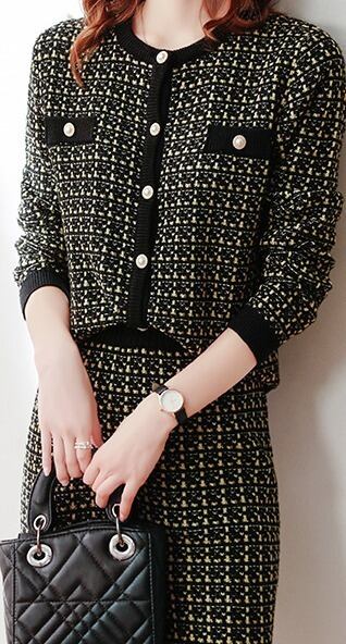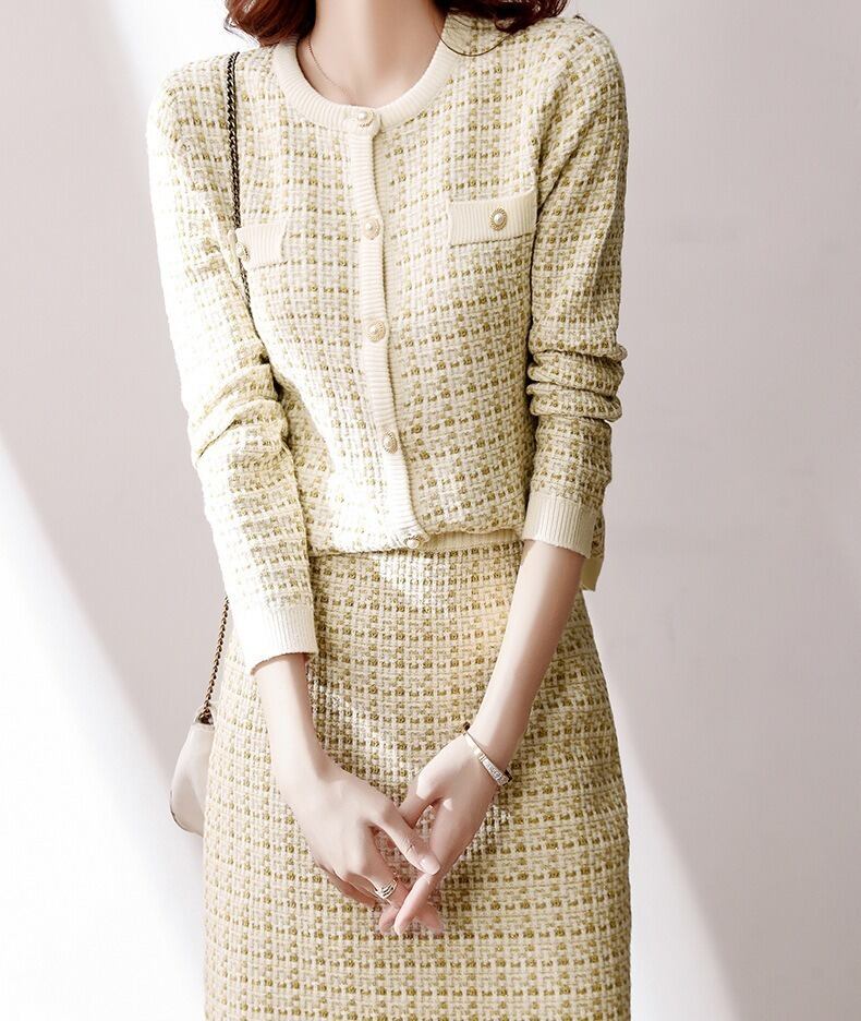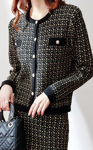 大人可愛いツイード織りニットのジャケット&スカートのセットアップです。