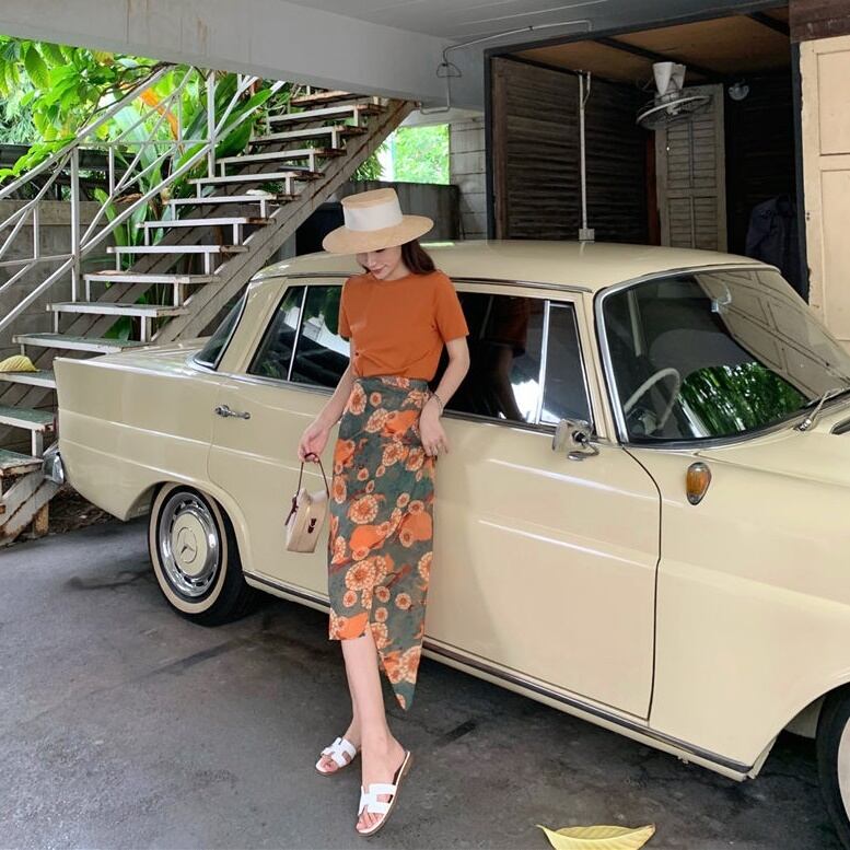 シンプルなTシャツと大花柄がレトロなラップスカートのセット。
