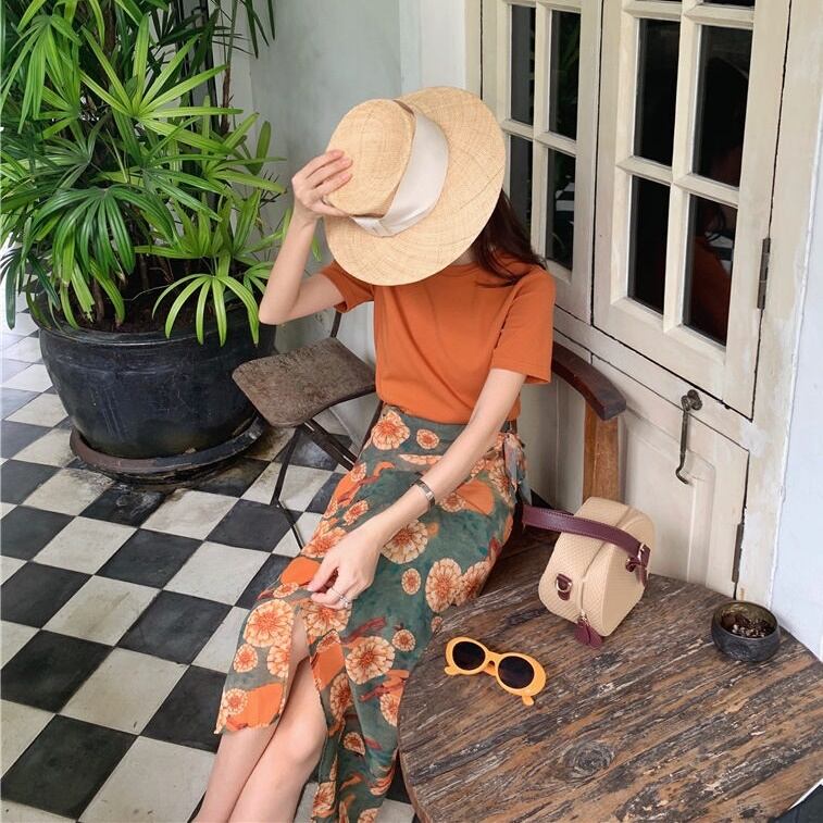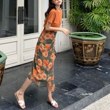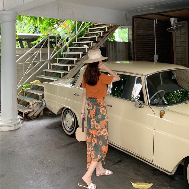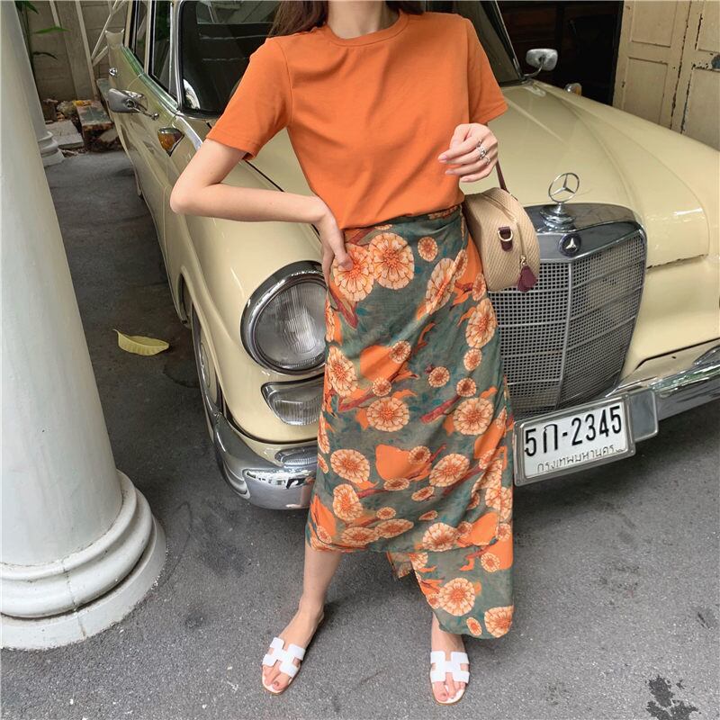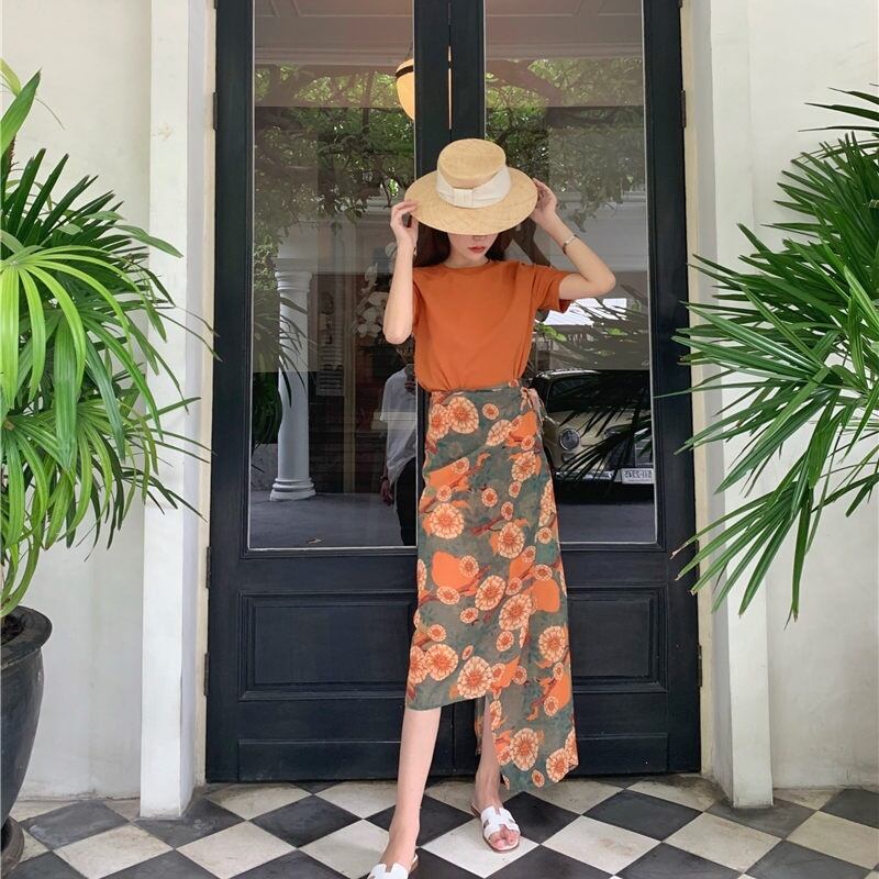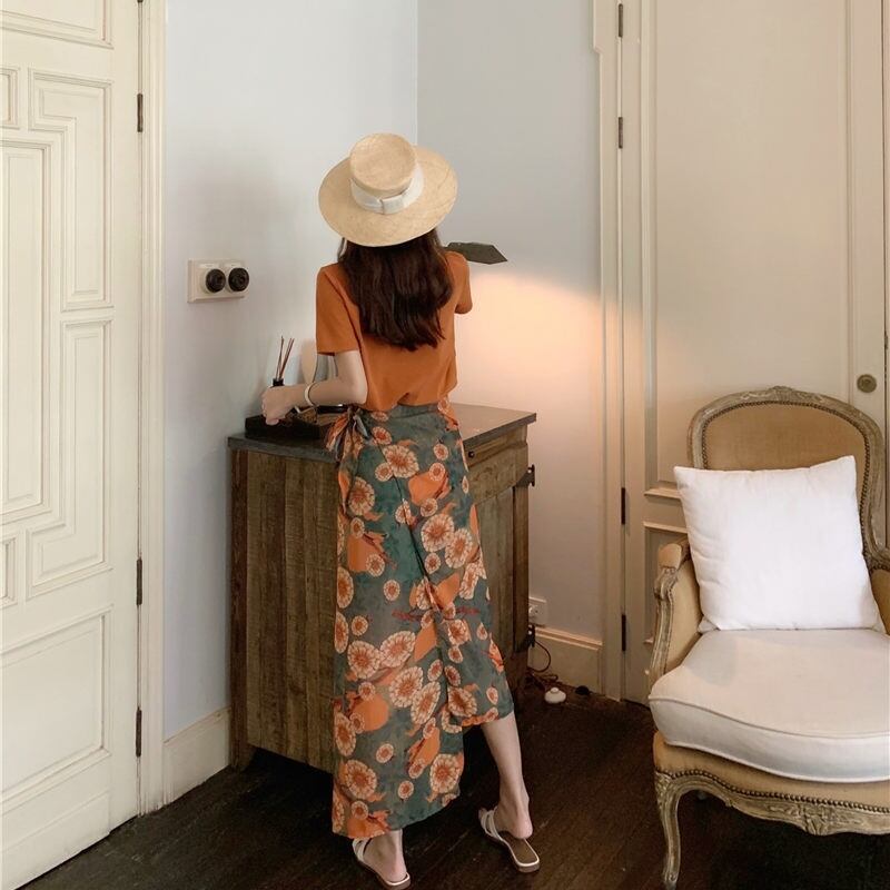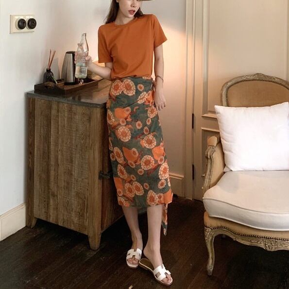 セットアップ2点セット ツーピース コーディネートセット Tシャツ ラップスカート 花柄 巻きスカート セットアイテム ストリート夏スーツ ハイウエスト 半袖ジャケット 脚長効果 ロング 襟付き ミモレ丈 ルーズ ミッドレングス おしゃれ モテ服 人気 安い クラシカル カジュアル 英国スタイル 可愛い カレッジスタイル カジュアルスーツ 夏 サマー デート 夏用 オールマッチ 謝恩会 結婚式二次会 20代 30代 レディース 女性用 OL S ゆったり M L オレンジ