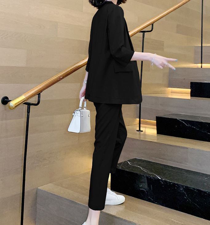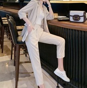 メリハリのあるスリムな仕立てが綺麗なパンツスーツセットです。