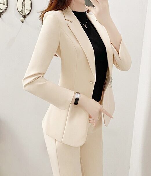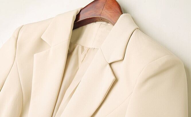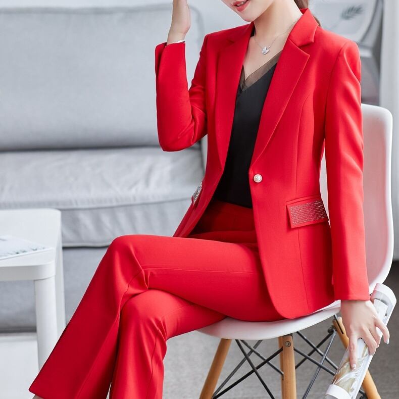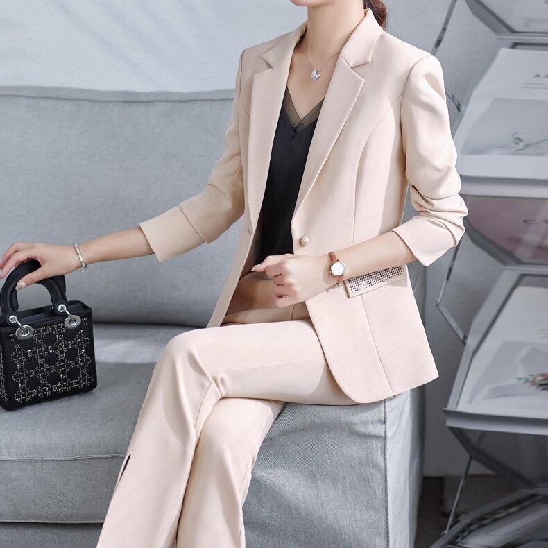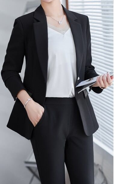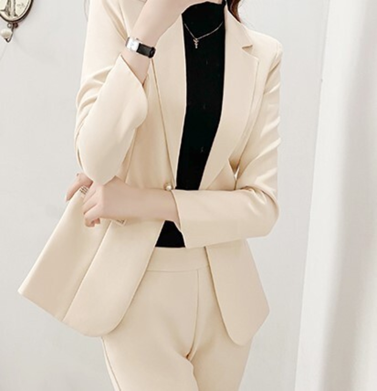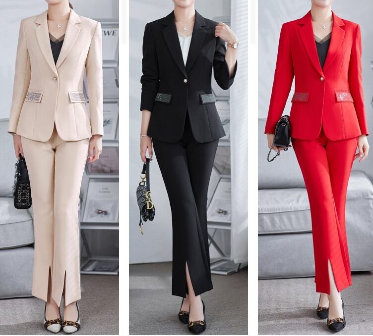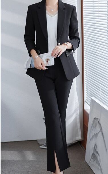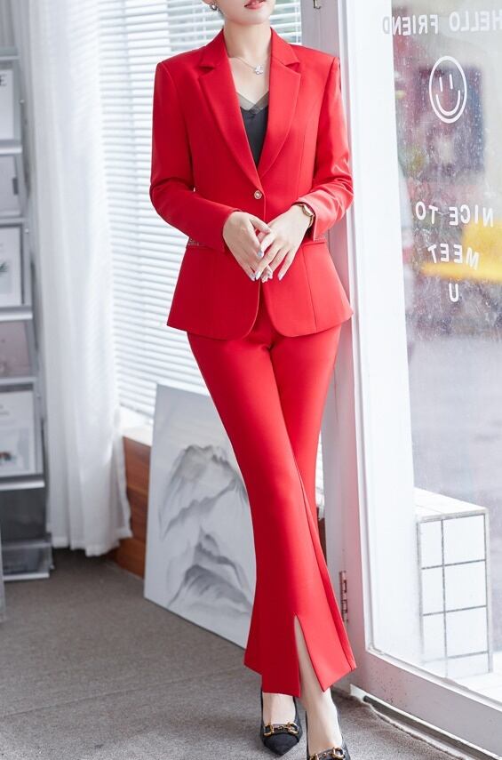 メリハリのあるスリムな仕立てが綺麗なパンツスーツセットです。