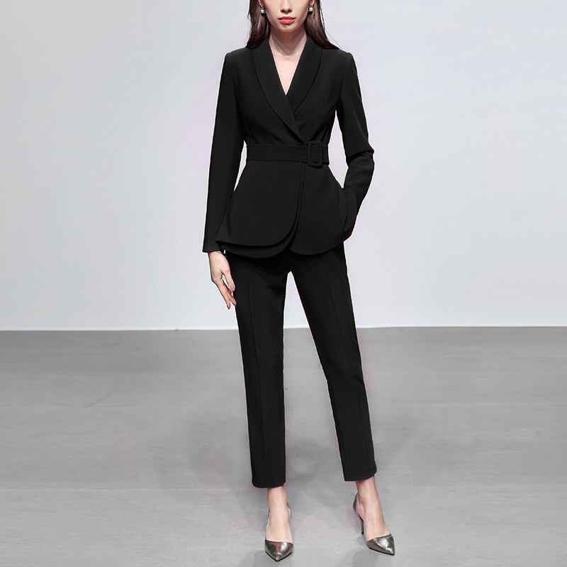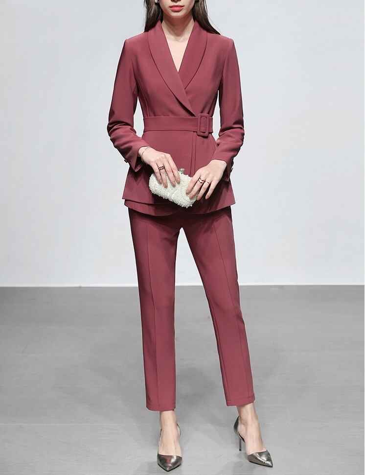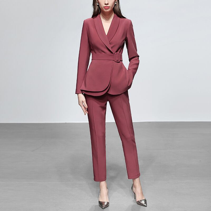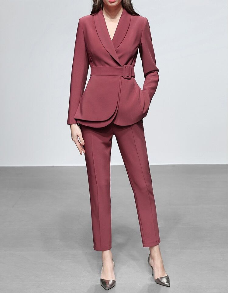セットアップ スーツ パンツ ボトムス ジャケット ベルト付き レイヤード ロールアップ スクエアバックル 長袖 ロング アンクル丈 ハイウエスト ストレート 襟付き Vネック レトロ ビッグシルエット 韓国 スリム タイト きれいめ 高品質 大人 上品 ストレートパンツ フォーマル 秋 オータム 冬 ウィンター レディース 女性用 20代 30代 S M L XL 黒 ブラック 緑 大人カラー 秋カラー フェミニン オフィス プロフェッショナル エレガント OL ピンク