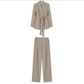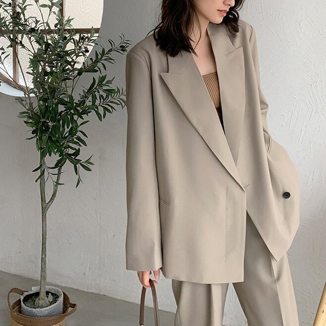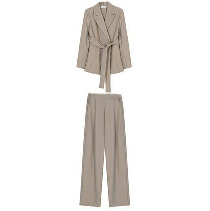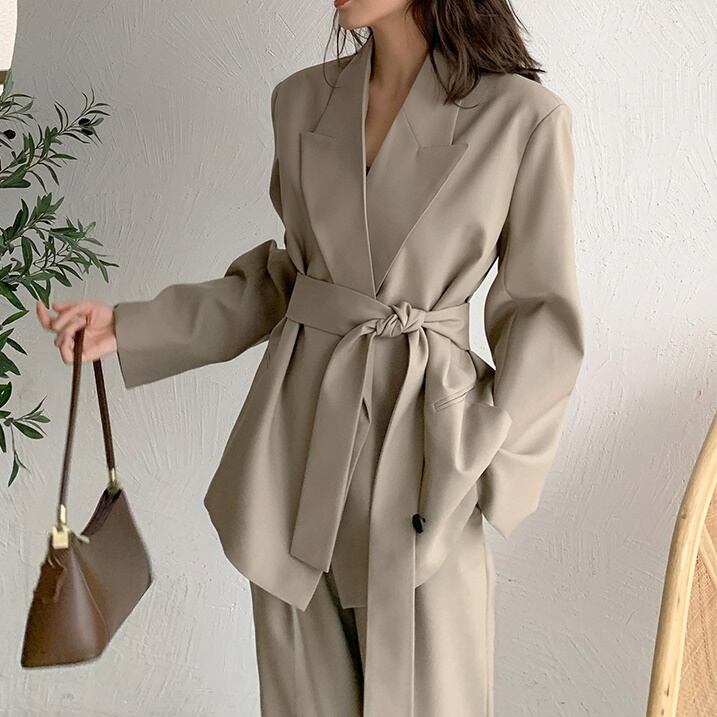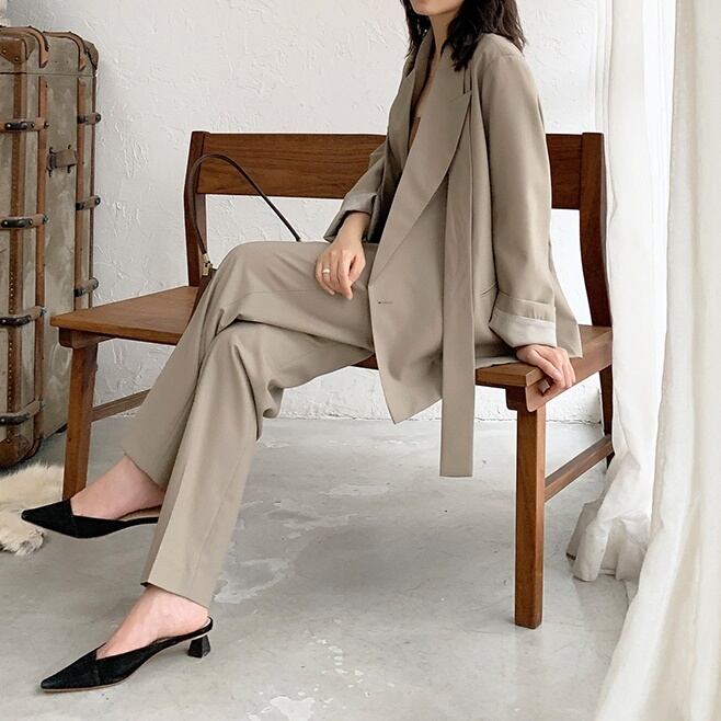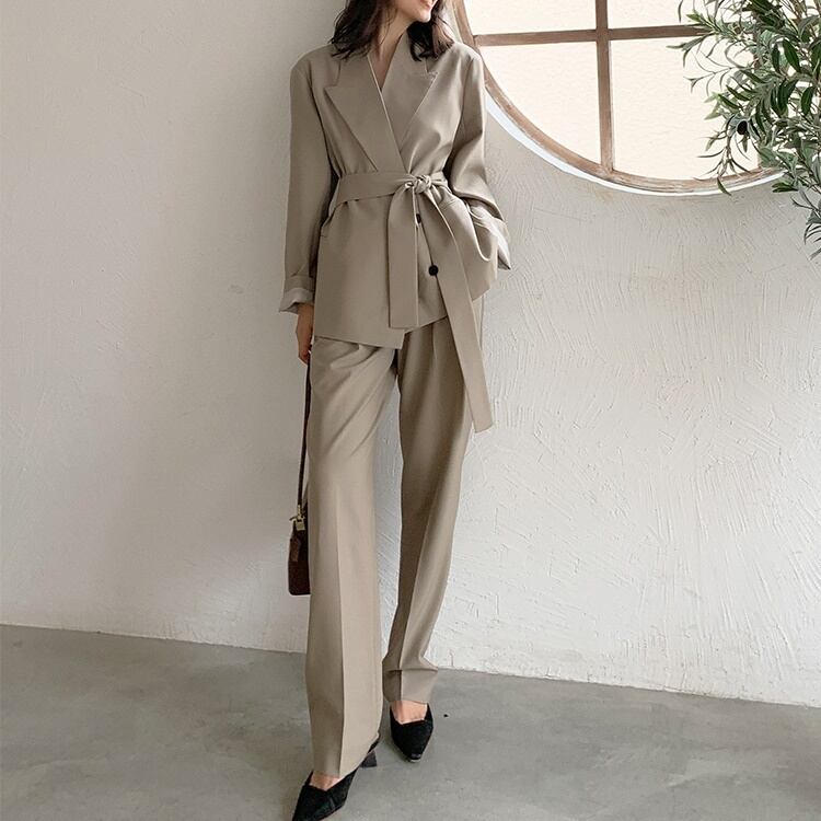 セットアップ スーツ パンツ ボトムス ジャケット ベルト付き レイヤード風 肩パッド カシュクール センタープレス 長袖 ロング ハイウエスト ストレート 襟付き Vネック レトロ ビッグシルエット 韓国 スリム タイト きれいめ 高品質 大人 上品 ストレートパンツ フォーマル 秋 オータム 冬 ウィンター レディース 女性用 20代 30代 S M L XL 黒 ブラック 緑 大人カラー 秋カラー フェミニン オフィス プロフェッショナル エレガント OL キャメル