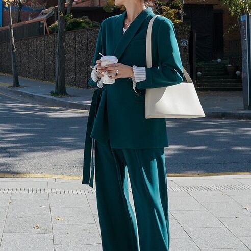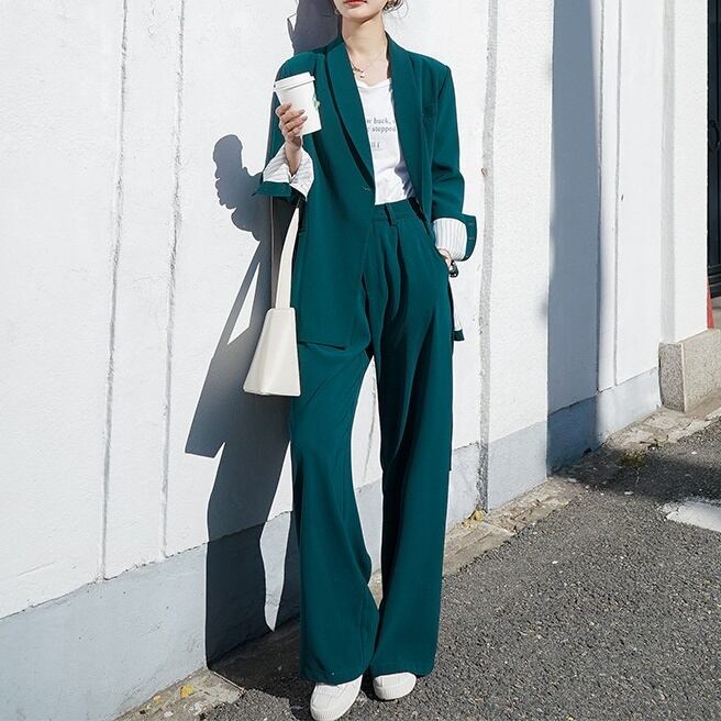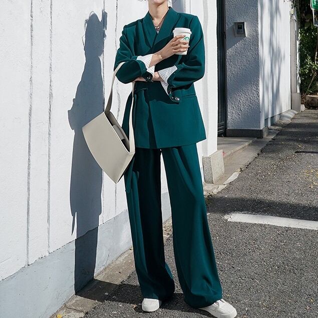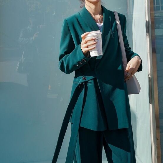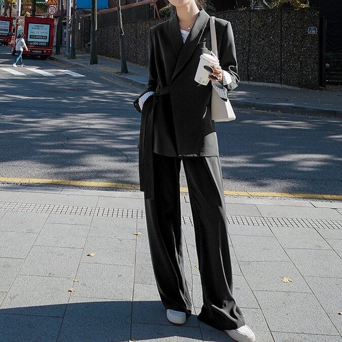 セットアップ スーツ パンツ ボトムス ジャケット アシンメトリー サイドベルト ストライプ裏地 ワンタック 長袖 ロング アンクル丈 ハイウエスト ストレート 襟付き Vネック レトロ ビッグシルエット 韓国 スリム タイト きれいめ 高品質 大人 上品 ストレートパンツ フォーマル 秋 オータム 冬 ウィンター レディース 女性用 20代 30代 S M L XL 黒 ブラック 緑 大人カラー 秋カラー フェミニン オフィス プロフェッショナル エレガント OL キャメル