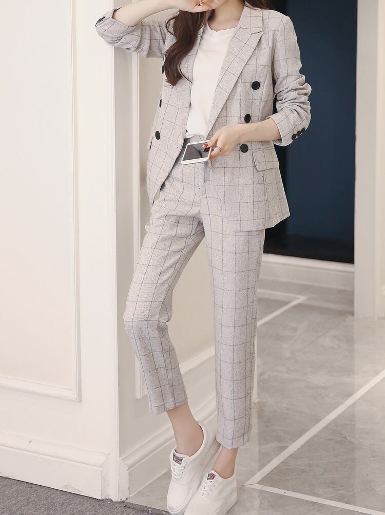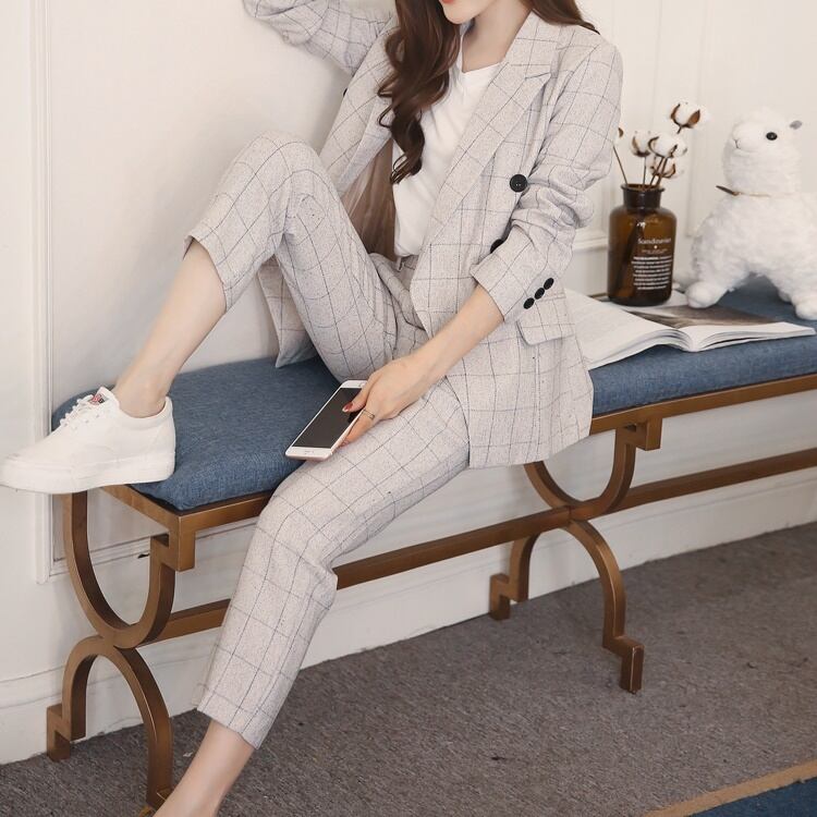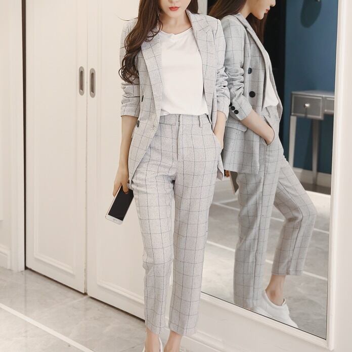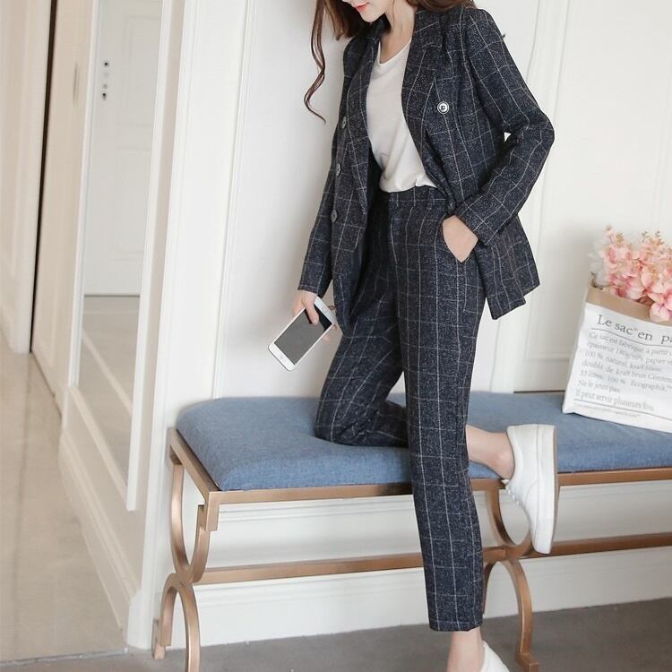 セットアップ スーツ パンツ ボトムス ジャケット ダブルブレスト 長袖 ロング チェック 格子柄 スラックス アンクル丈 ハイウエスト ストレート 襟付き Vネック レトロ ビッグシルエット 韓国 スリム タイト きれいめ 高品質 大人 上品 ストレートパンツ フォーマル 秋 オータム 冬 ウィンター レディース 女性用 20代 30代 S M L XL 黒 ブラック 緑 大人カラー 秋カラー フェミニン オフィス プロフェッショナル エレガント OL ベージュ ネイビー