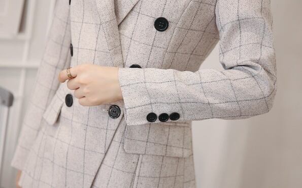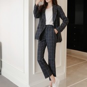 メリハリのあるスリムな仕立てが綺麗なチェックパンツスーツセットです。