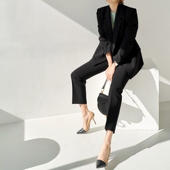 センタープレス入りのモードなクロップドパンツの2点セットです。