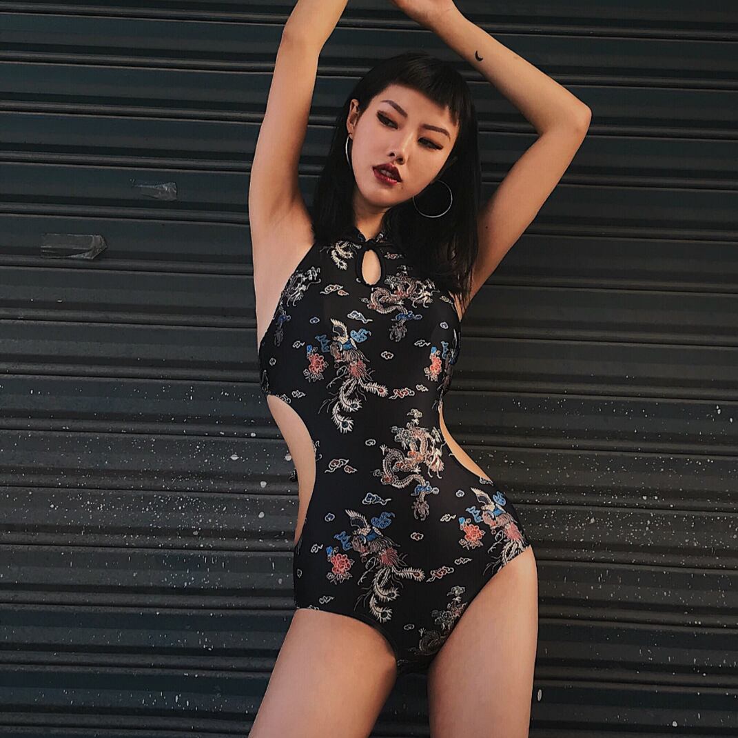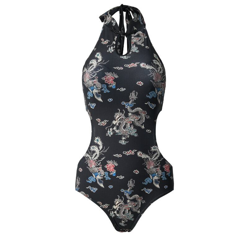漆黒ブラックの中に雰囲気ある竜が描かれたセクシー水着です。